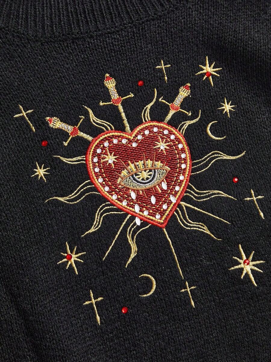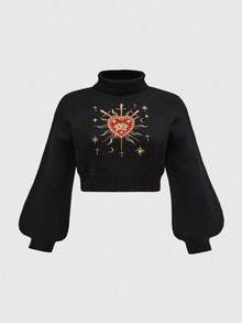 Goth Plus Size Women Gothic Romantic Heart Embroidery Rhinestone Crystal Teardrop Star Decor Turtleneck Sweater