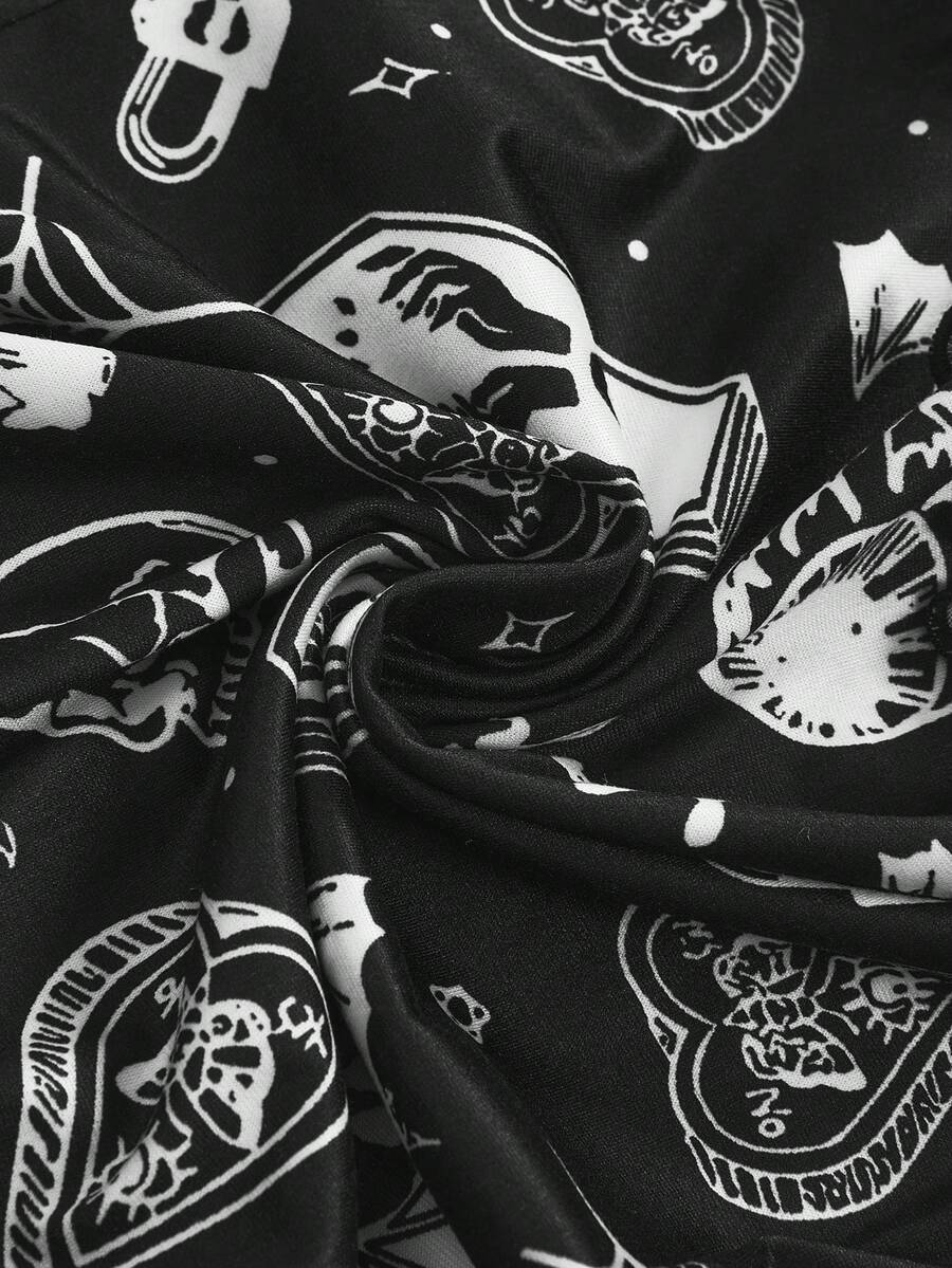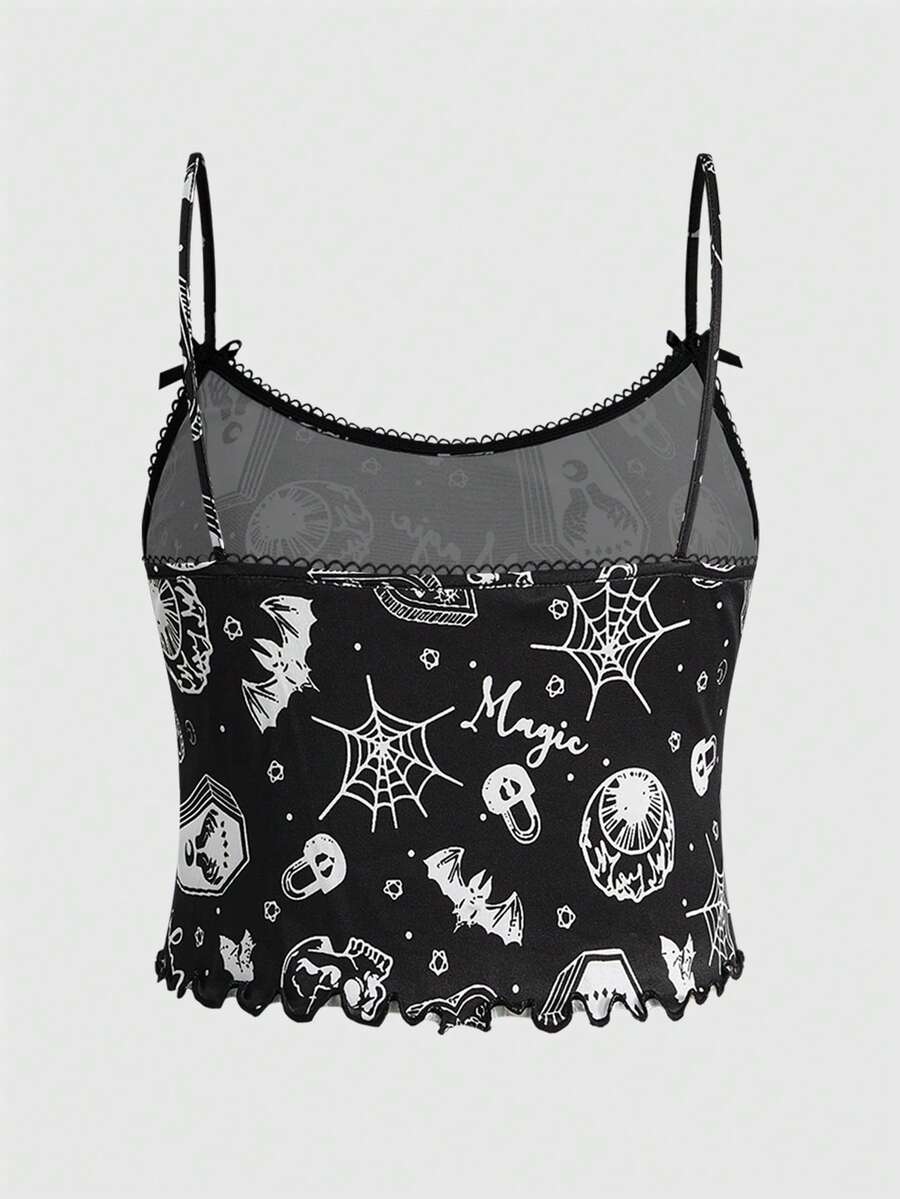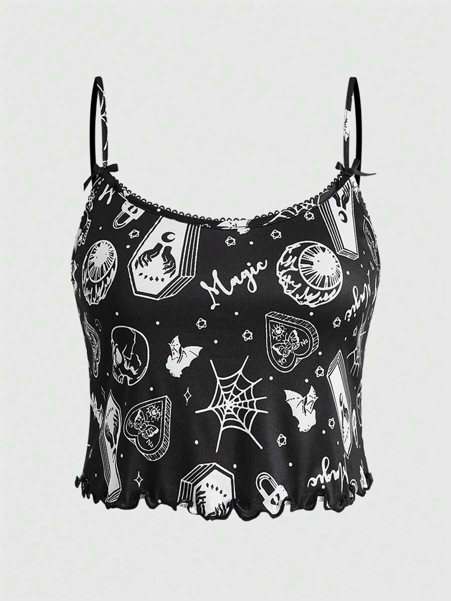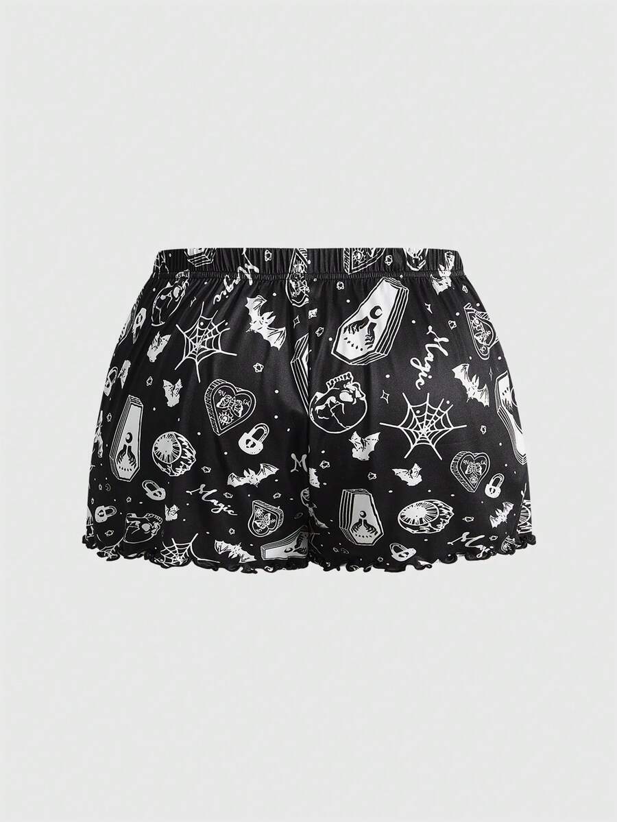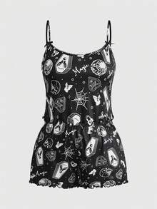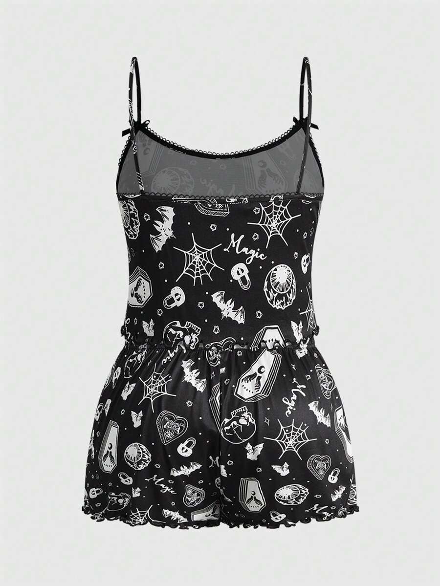 Plus Size Women Gothic Skull, Spider, Bat All-Over Print Contrast Strap Camisole & Shorts Pajama Set
