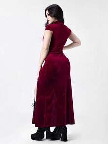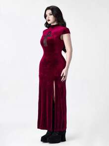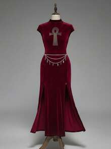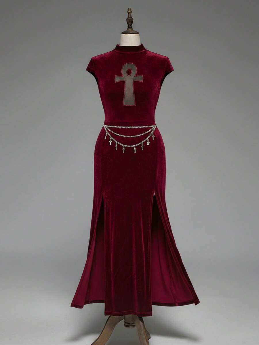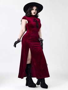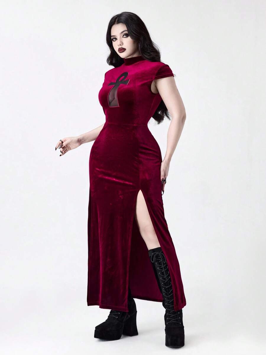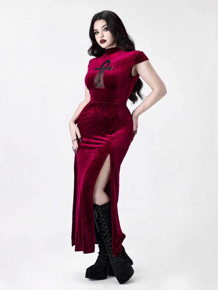 Plus Size Women Gothic Vampire Tight-Fitting Ancient Egyptian Cross Hollow High Slit Dress