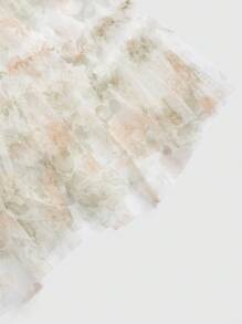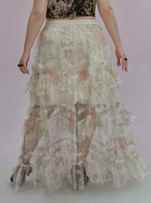 Plus Size Women Retro Elegant Ruffled Organza Floral Print Skirt