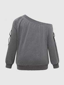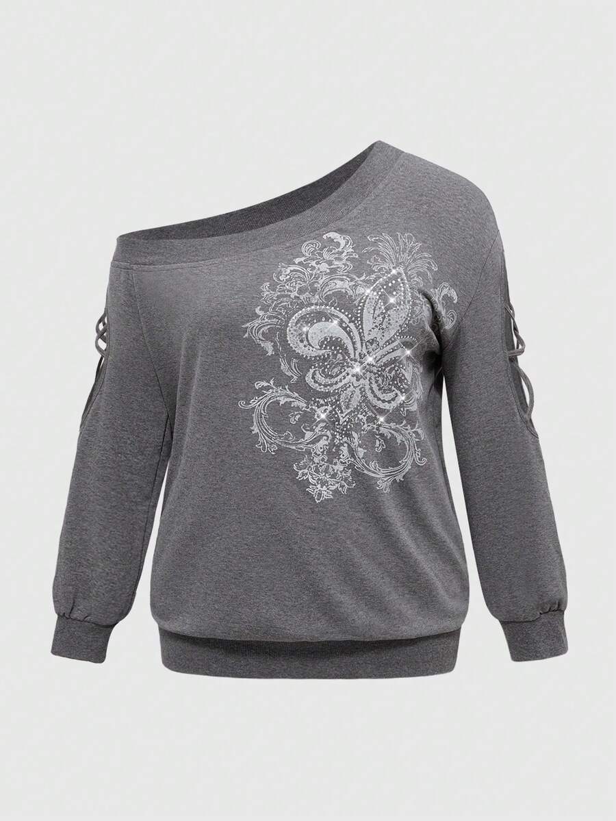 Grunge Punk Plus Size Women Retro Pattern Rhinestone Cutout Sleeve Criss-Cross Off-Shoulder Sweatshirt, Slimming