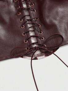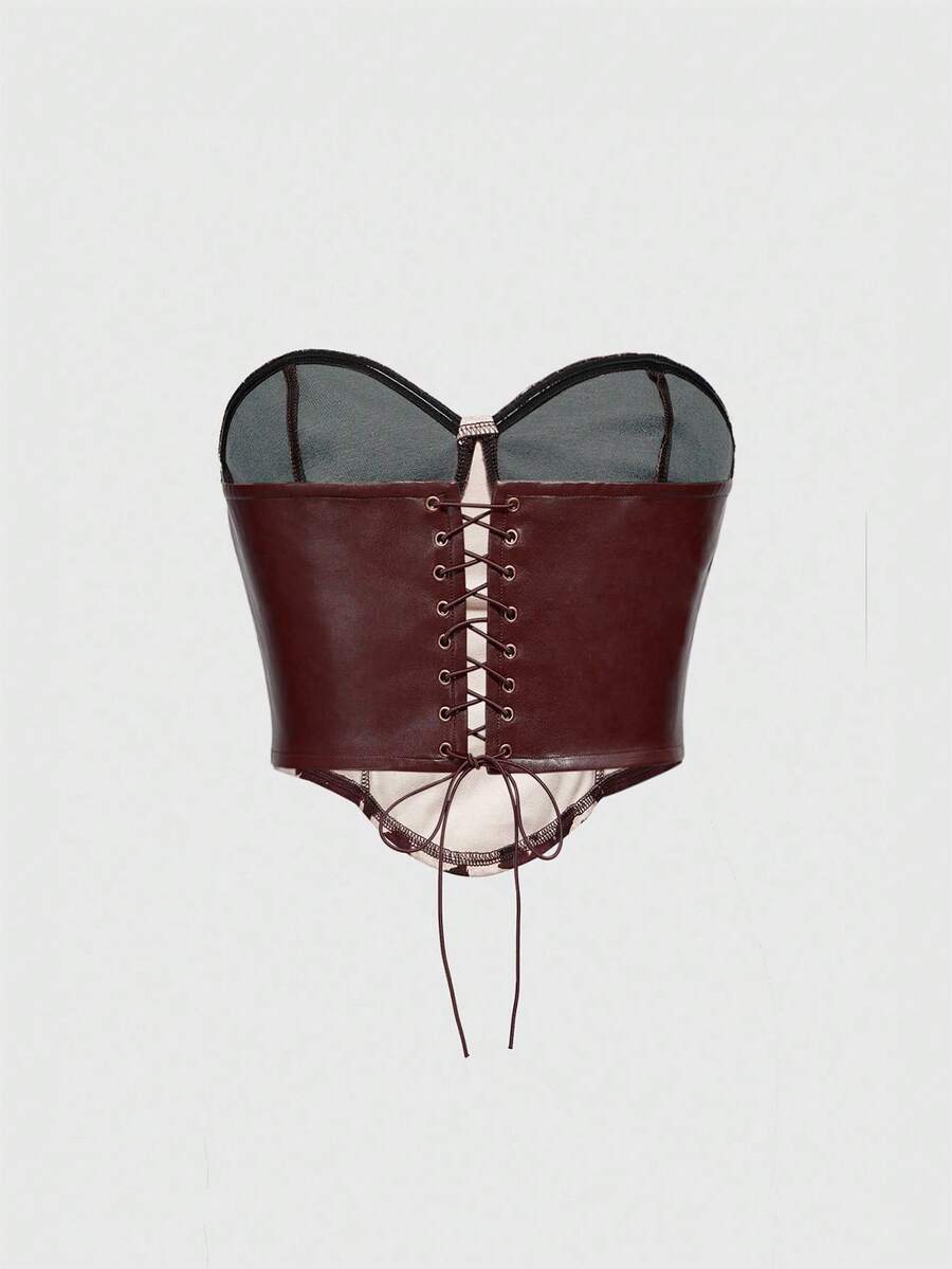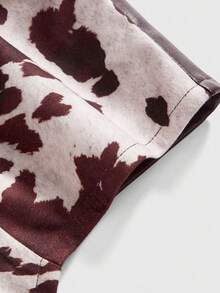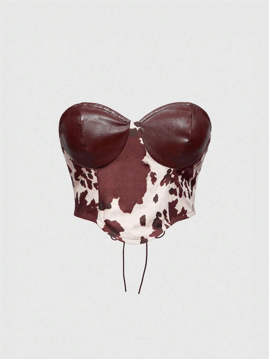 Plus Size Women Y2K Patchwork Cow Print Crop Top, Retro Punk Hippie Style, Suitable For Music Festivals, Vacations, Casual Wear, Burgundy Faux Leather Trim Cropped Camisole