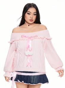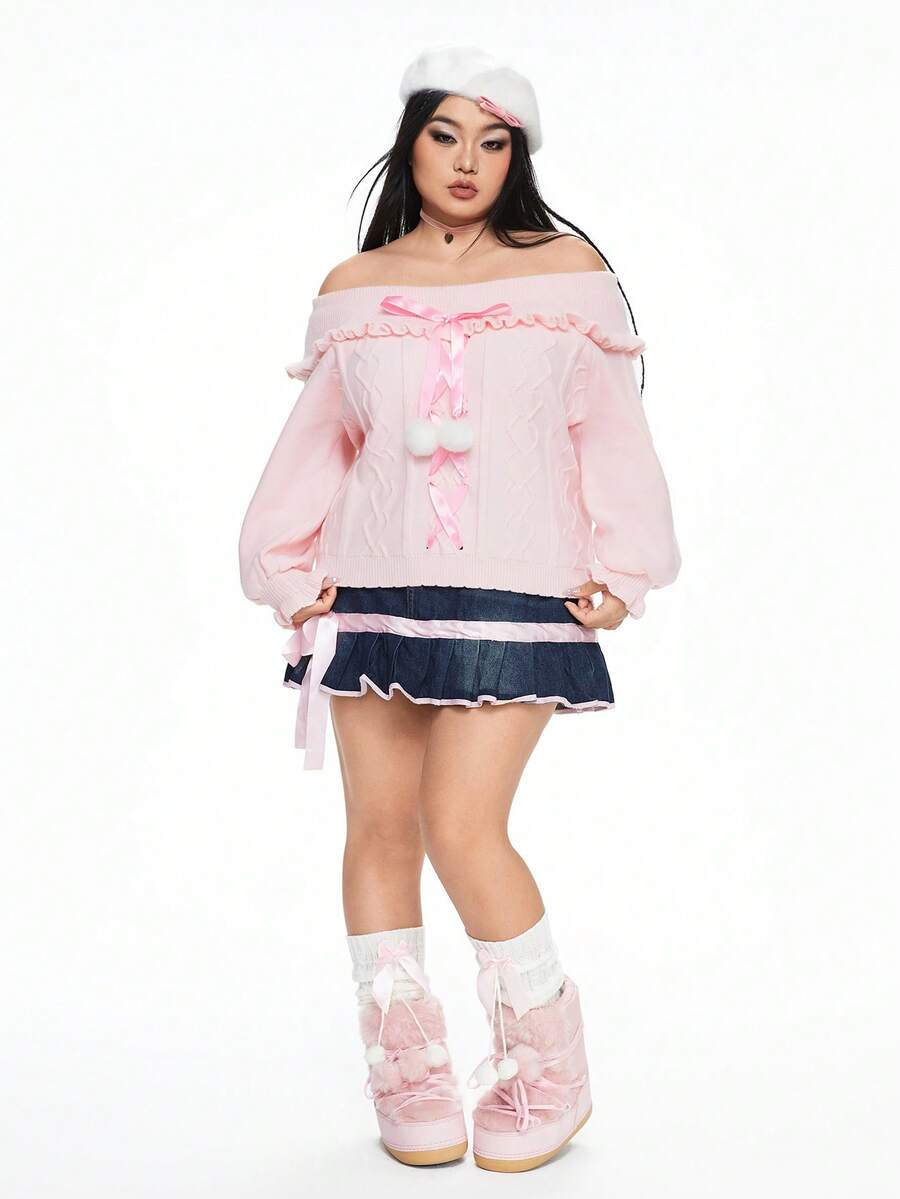 Plus Size Women's Kawaii Ribbon Yarn Ball Off-Shoulder Pullover Sweater