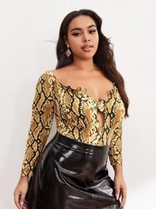 Plus Snakeskin Print Cut Out Front Frill Trim Bodysuit