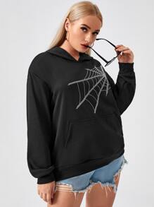 Plus Spider Web Rhinestone Hooded Sweatshirt