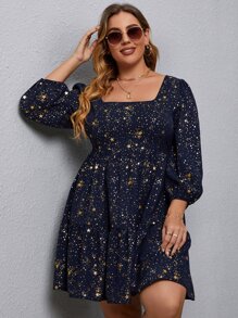 Plus Star Print Bishop Sleeve Ruffle Hem Dress