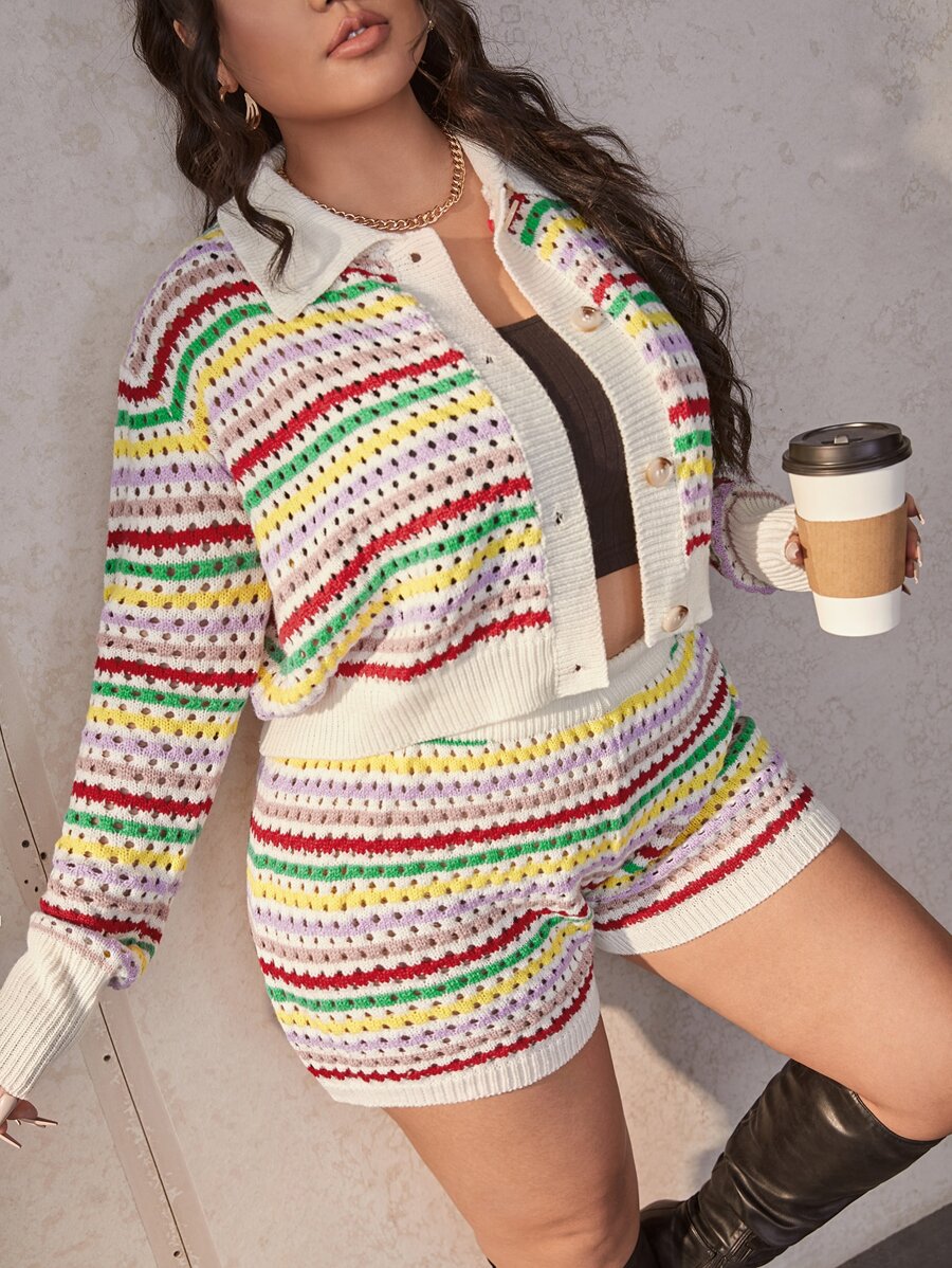 Plus Striped Open Knit Cardigan & Knit Shorts Set