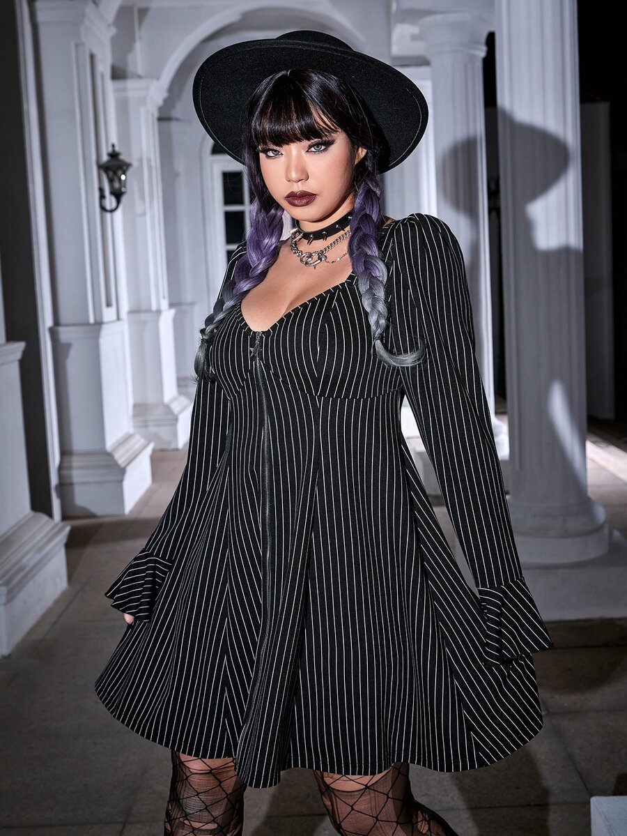 Plus Striped Print Flounce Sleeve Zip Up Dress