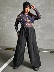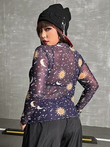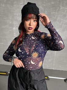 Plus Sun & Moon Print Mock Neck Mesh Top Without Bra