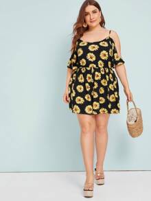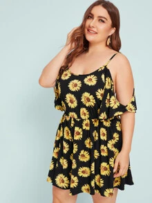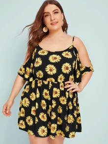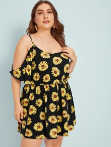 Plus Sunflower Print Cold Shoulder Romper