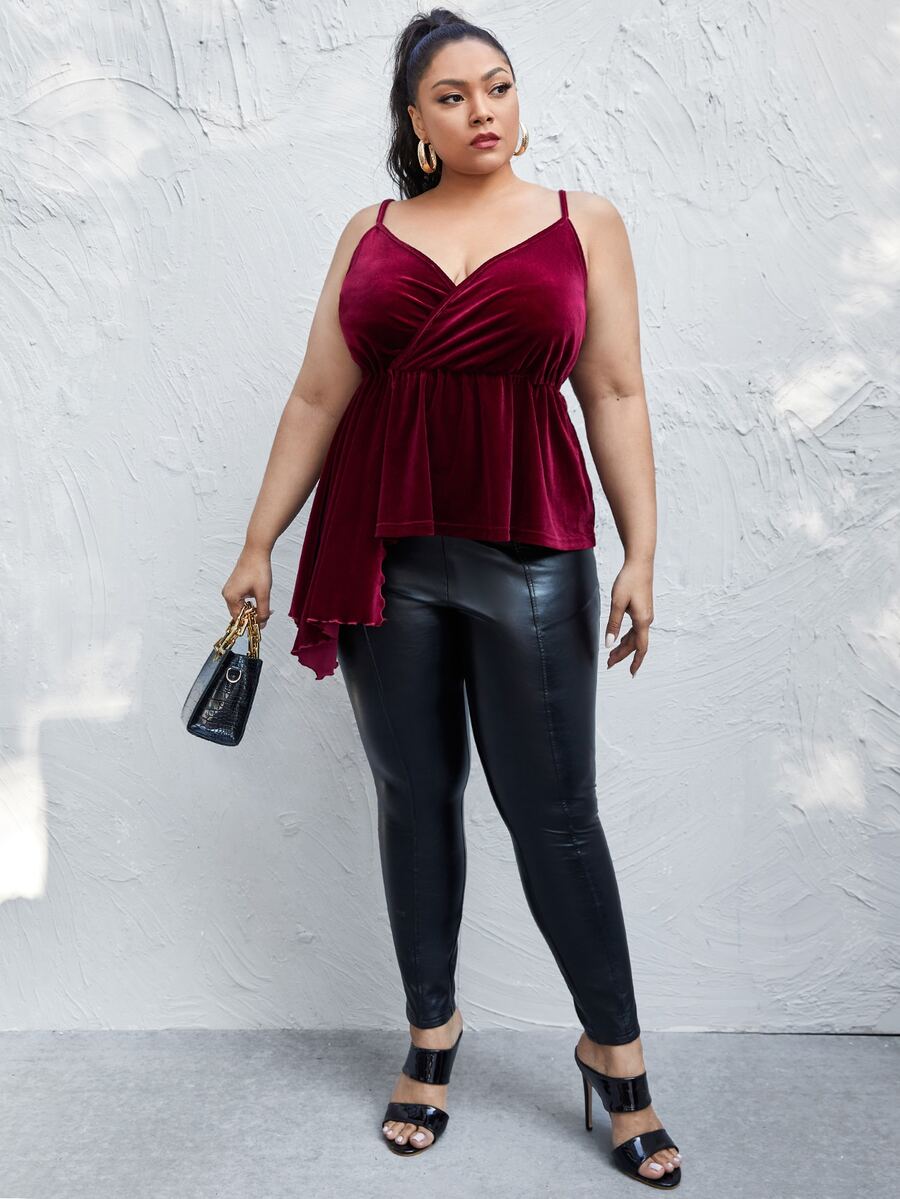 Plus Surplice Neck Draped Front Cami Peplum Velvet Top