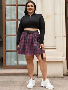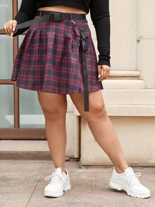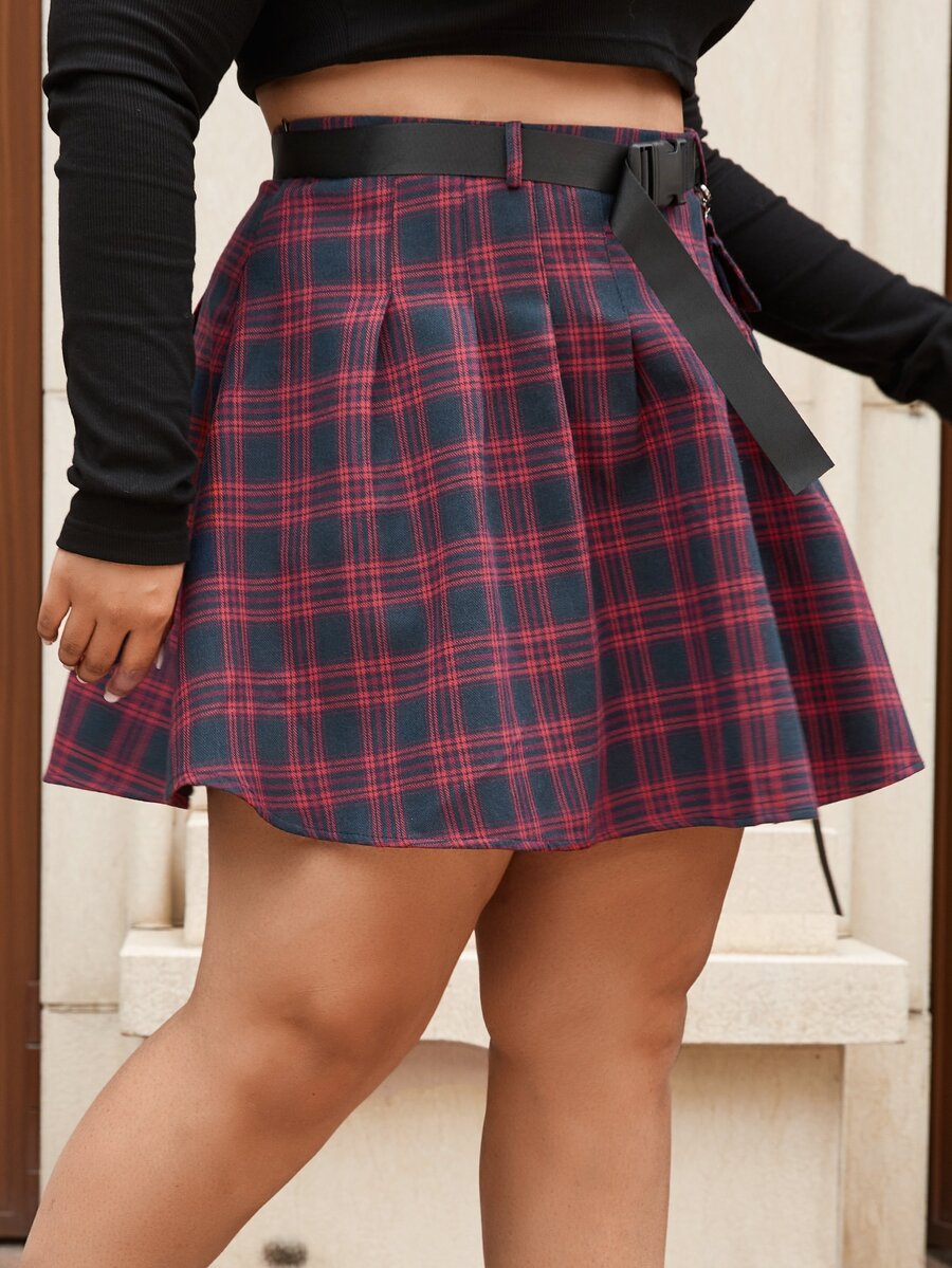 Plus Tartan Buckle Belted Flap Pocket Skirt