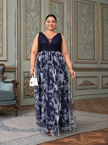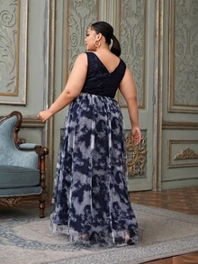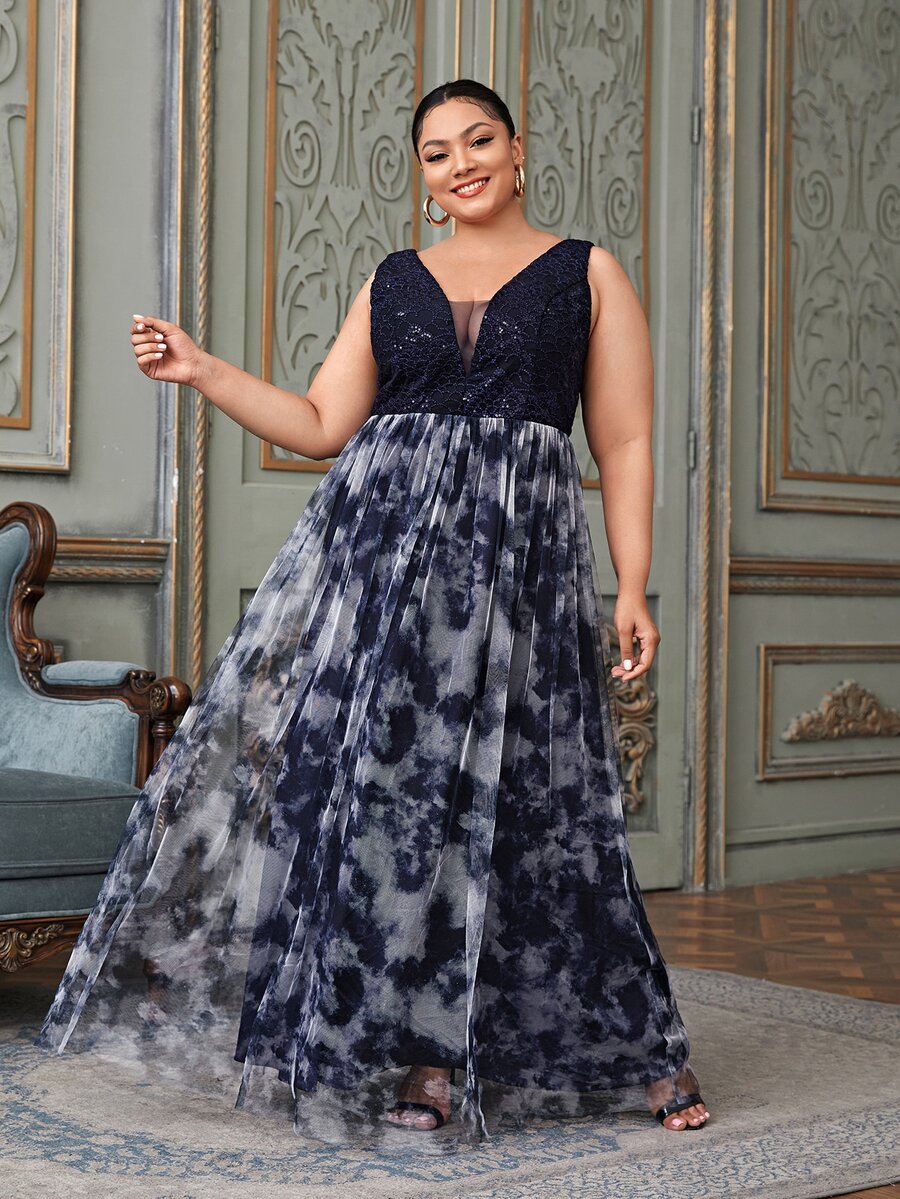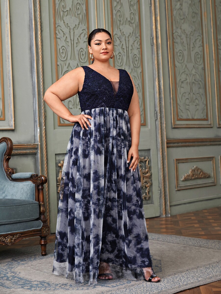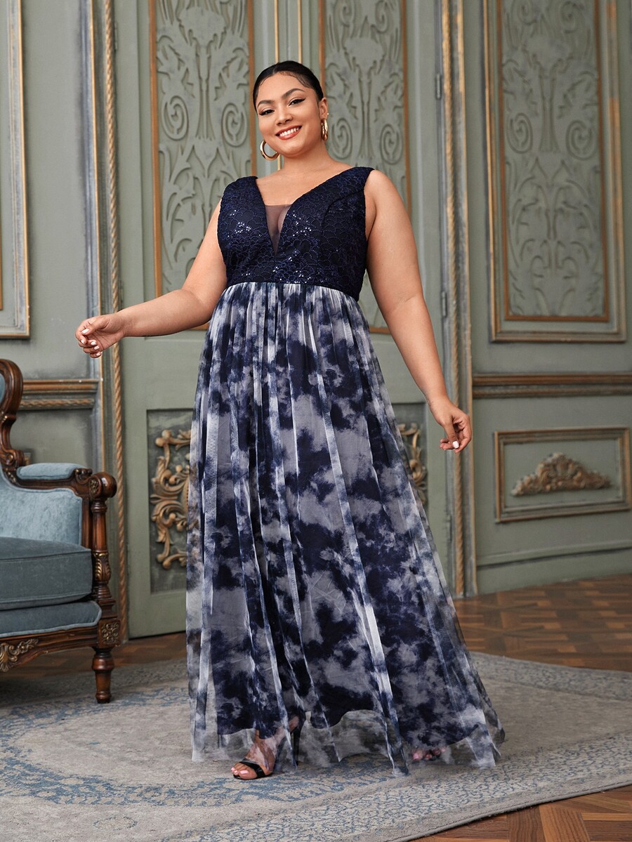 Plus Tie Dye Contrast Sequin Plunging Neck Maxi Prom Dress