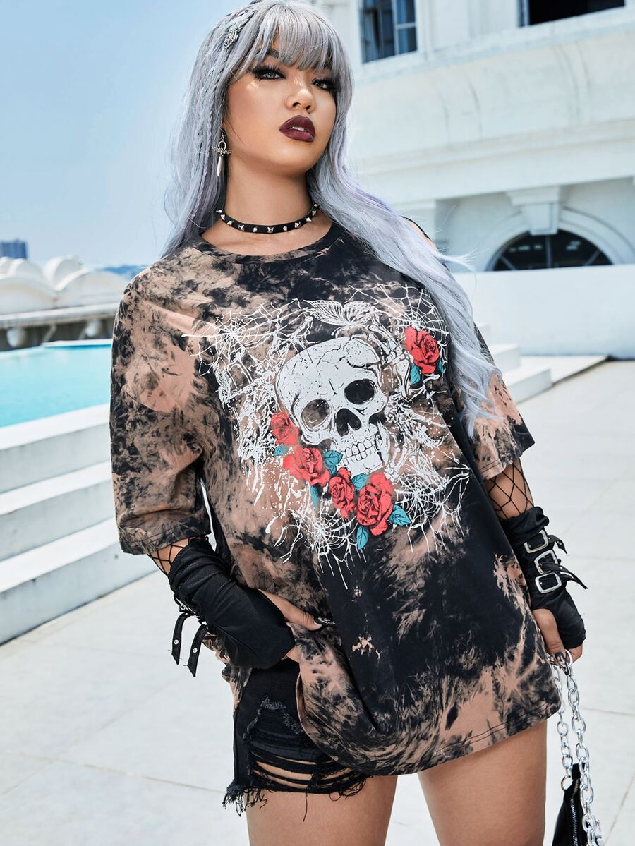 Plus Tie Dye Floral & Skull Print Drop Shoulder Tee