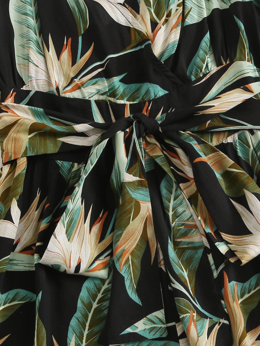 Plus Tropical Print Shirred Waist Self Tie Summer Boho Romper