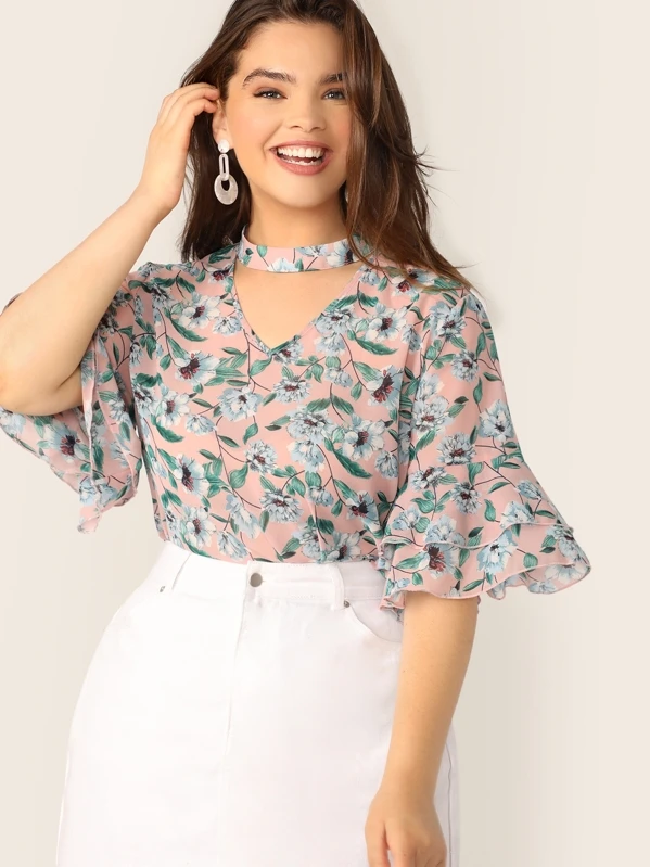 Plus V-cut Choker Floral Print Butterfly Sleeve Blouse