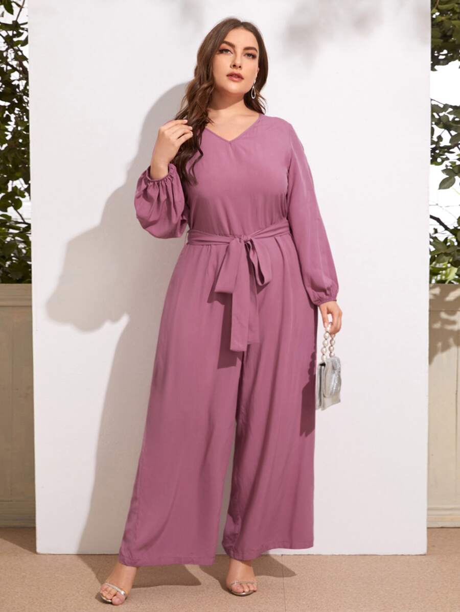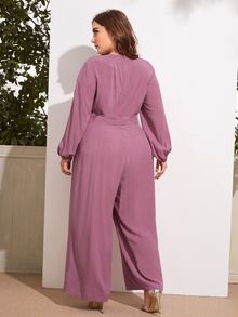 Plus V-neck Lantern Sleeve Belted Palazzo Jumpsuit