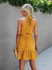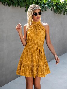 Polka Dot Halter Neck Ruffle Hem Belted Dress