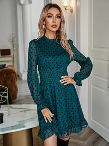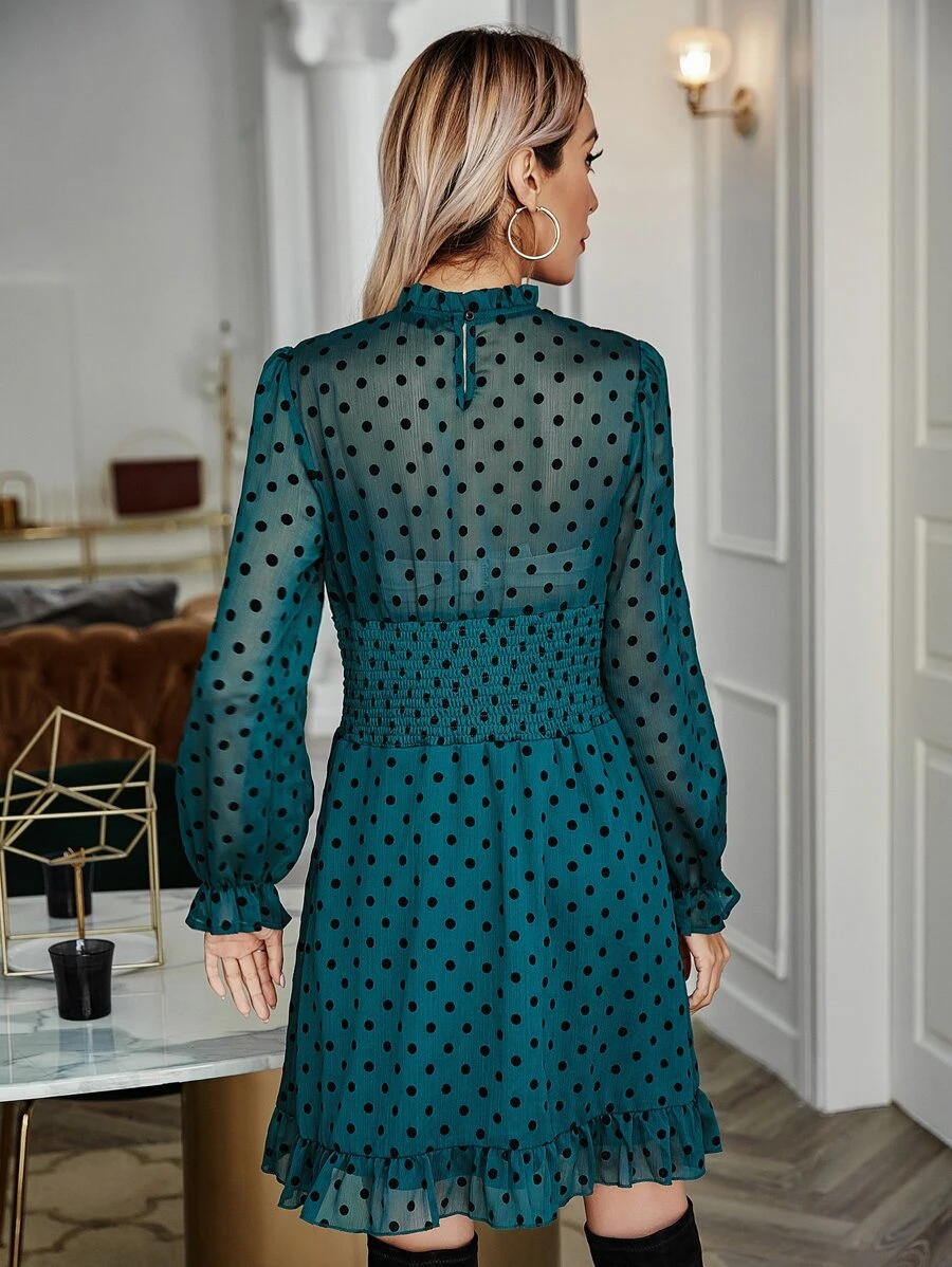 Polka Dot Shirred Waist Ruffle Hem Flowy Dress