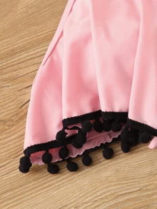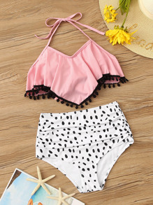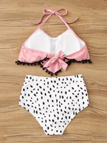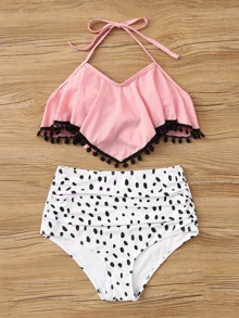 Pom-pom Hanky Hem Top With Dalmatian Bikini Set