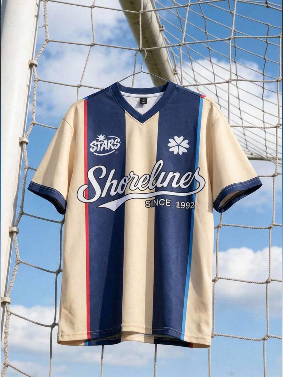 Prep Men's Casual Fashion Street Sporty V-Neck Loose Short Sleeve Letter Contrast Stripe Print T-Shirt, Summer