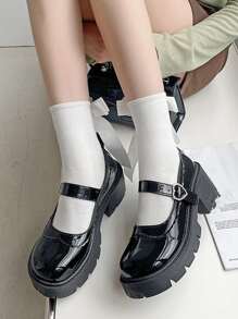 Preppy Black Mary Jane Shoes For Women, Heart Buckle Decor Platform Shoes