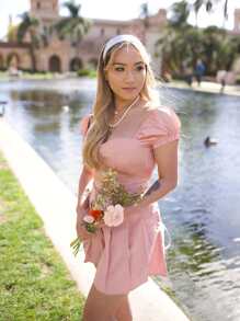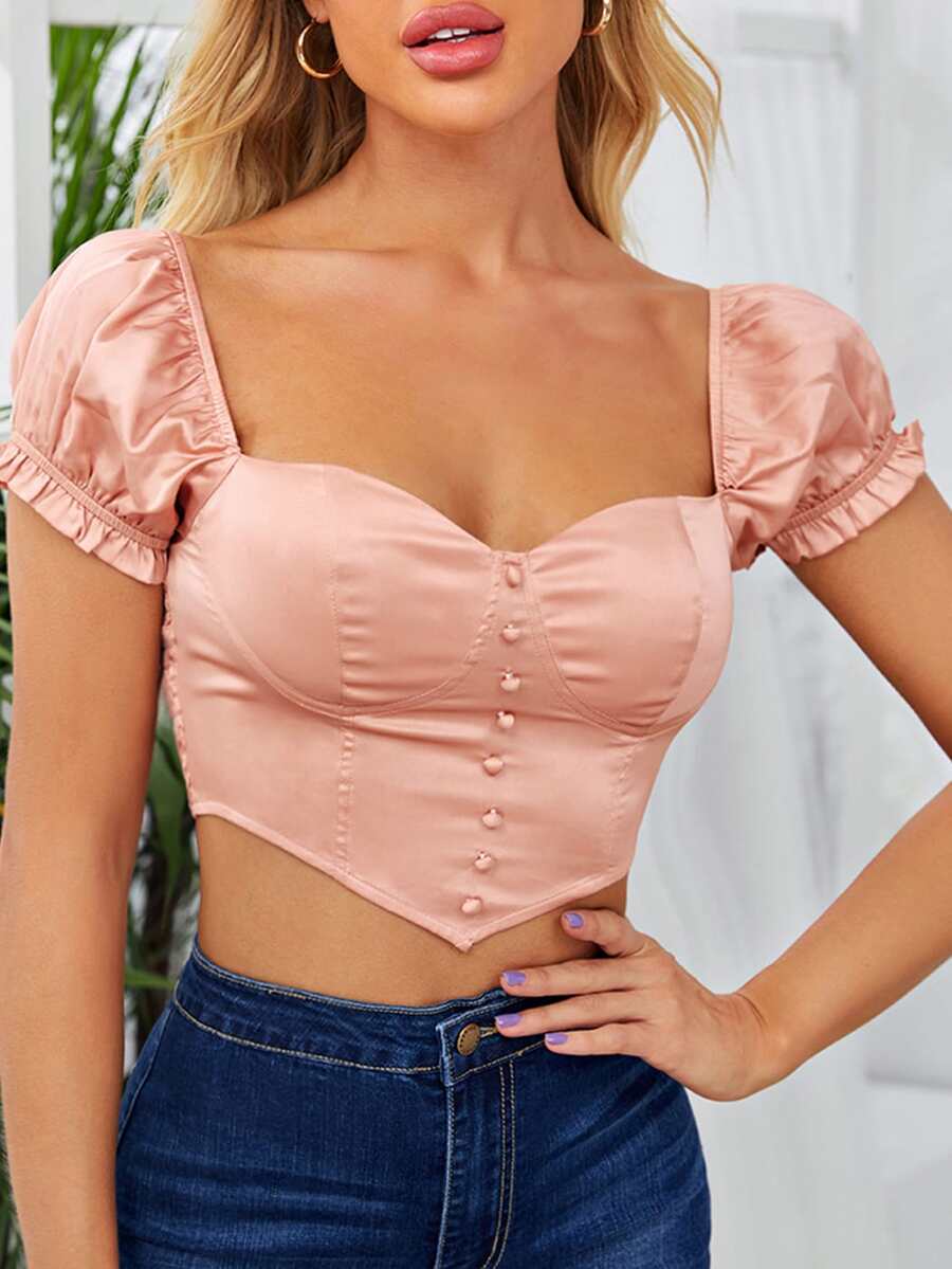 Puff Sleeve Shirred Back Asymmetrical Hem Satin Milkmaid Top