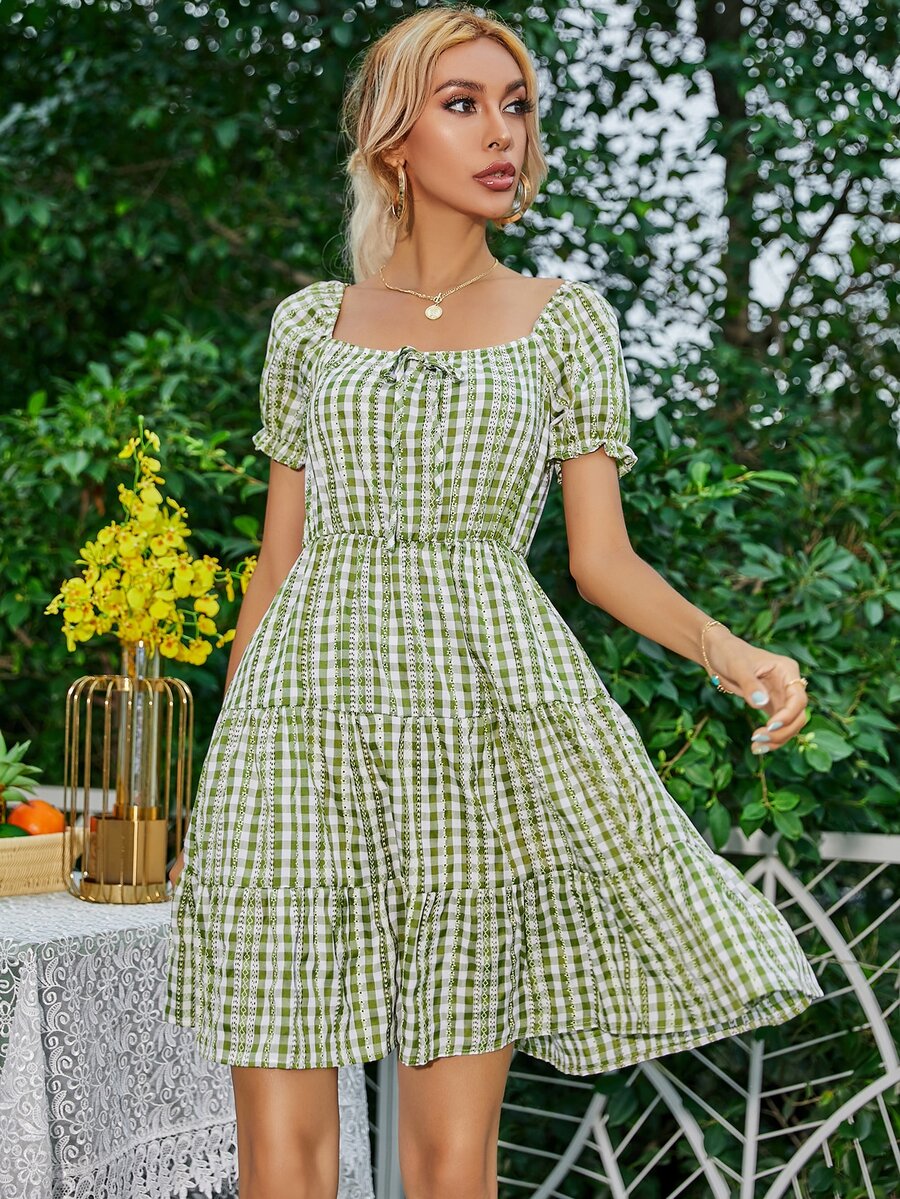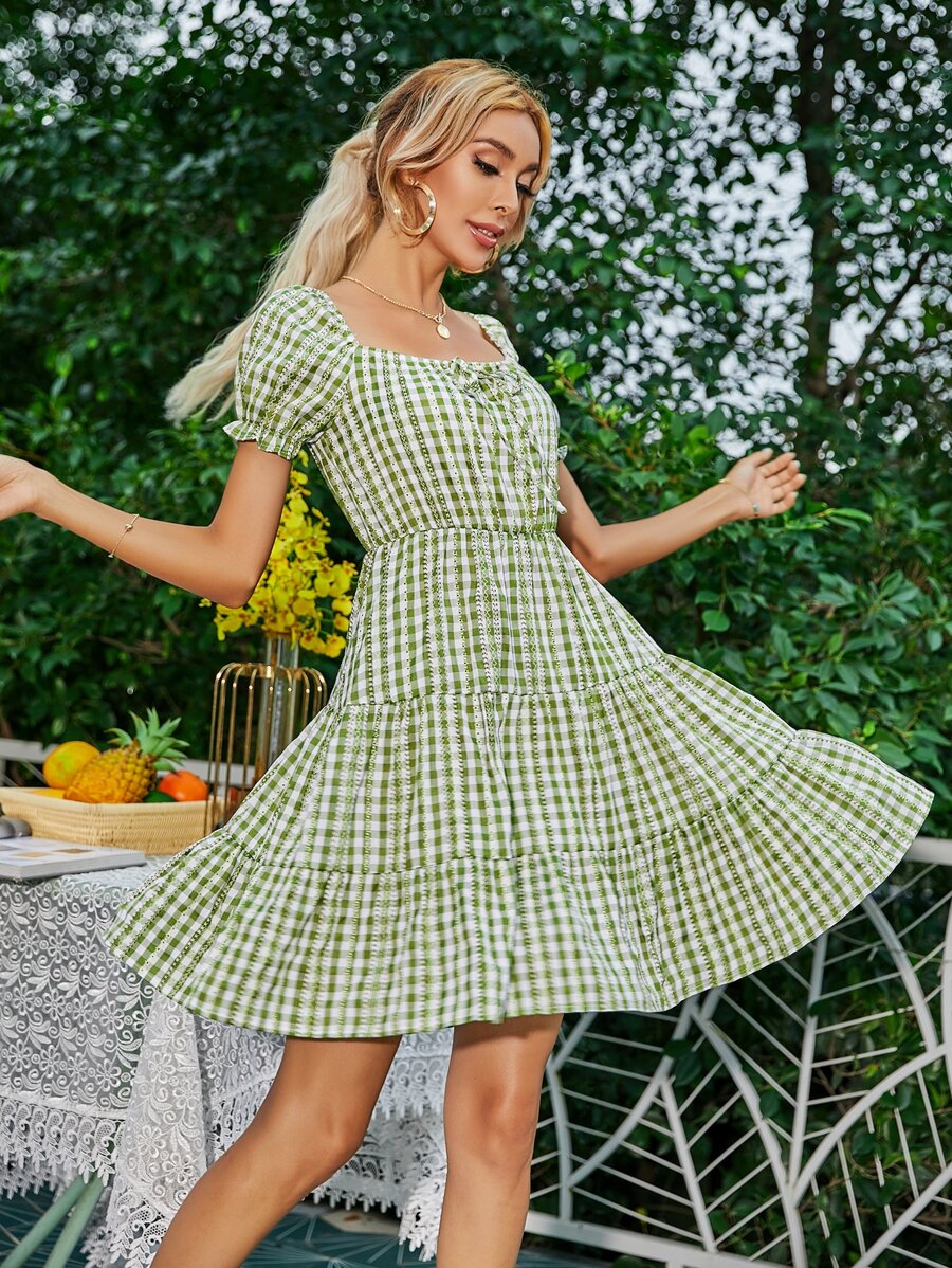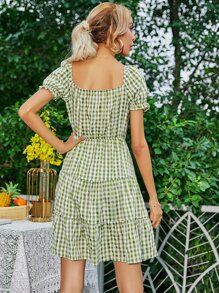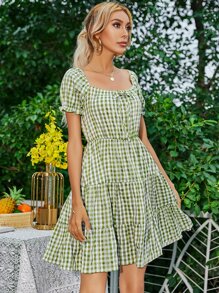 Puff Sleeve Tie Front Gingham & Striped Dress