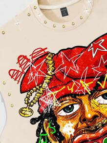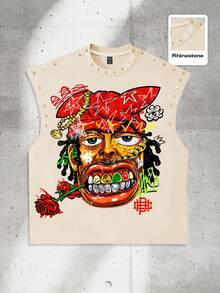 Street Life Punk Exaggerated Print Rhinestone Decor Sleeveless Crew Neck Tank Top For Men