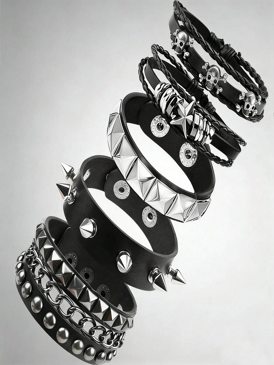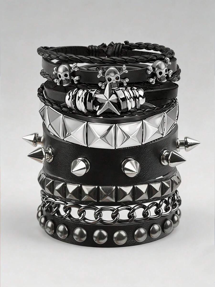 Punk Gothic Leather Bracelet Set For Men Women, Skull Spike Pyramid Stud Stackable Bracelets, Y2K Rock Jewelry