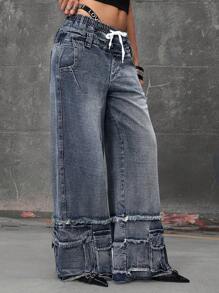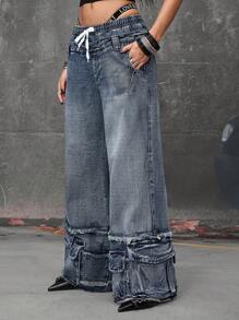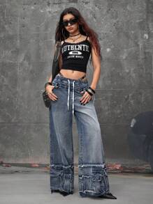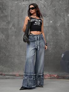 Grunge Punk Punk Retro Washed Lightning Oversized Look 2 In 1 Women Jeans, Suitable For Concert Festival