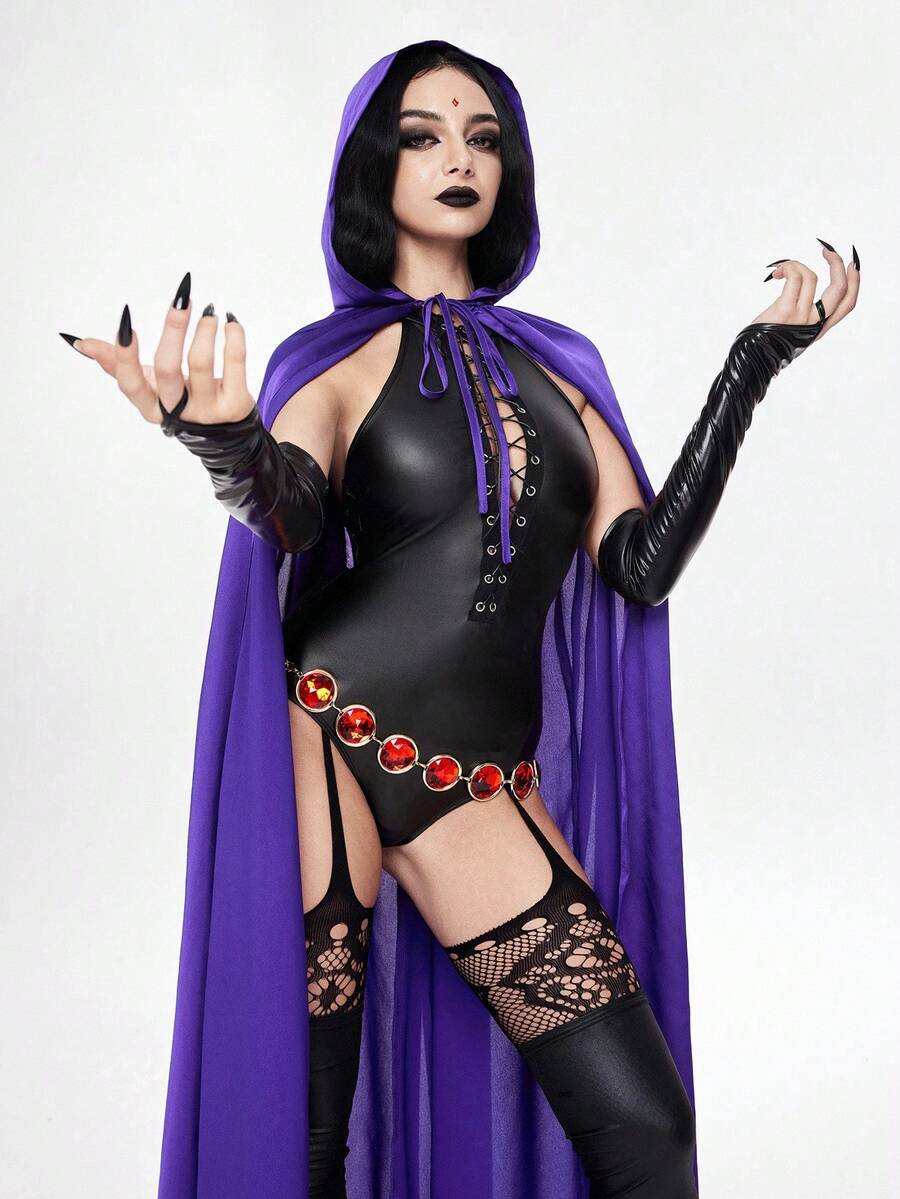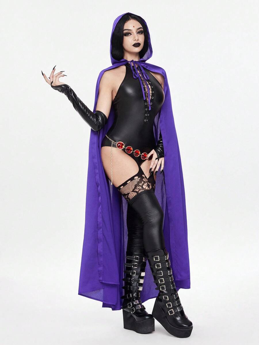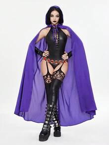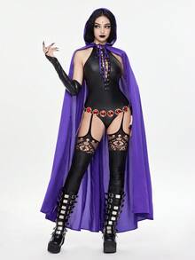 ROMWE Avant 2pcs Halloween Costume For Women - Front Tie Jumpsuit With Purple Hooded Cape