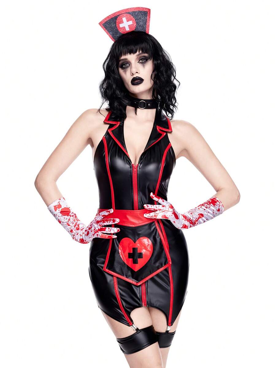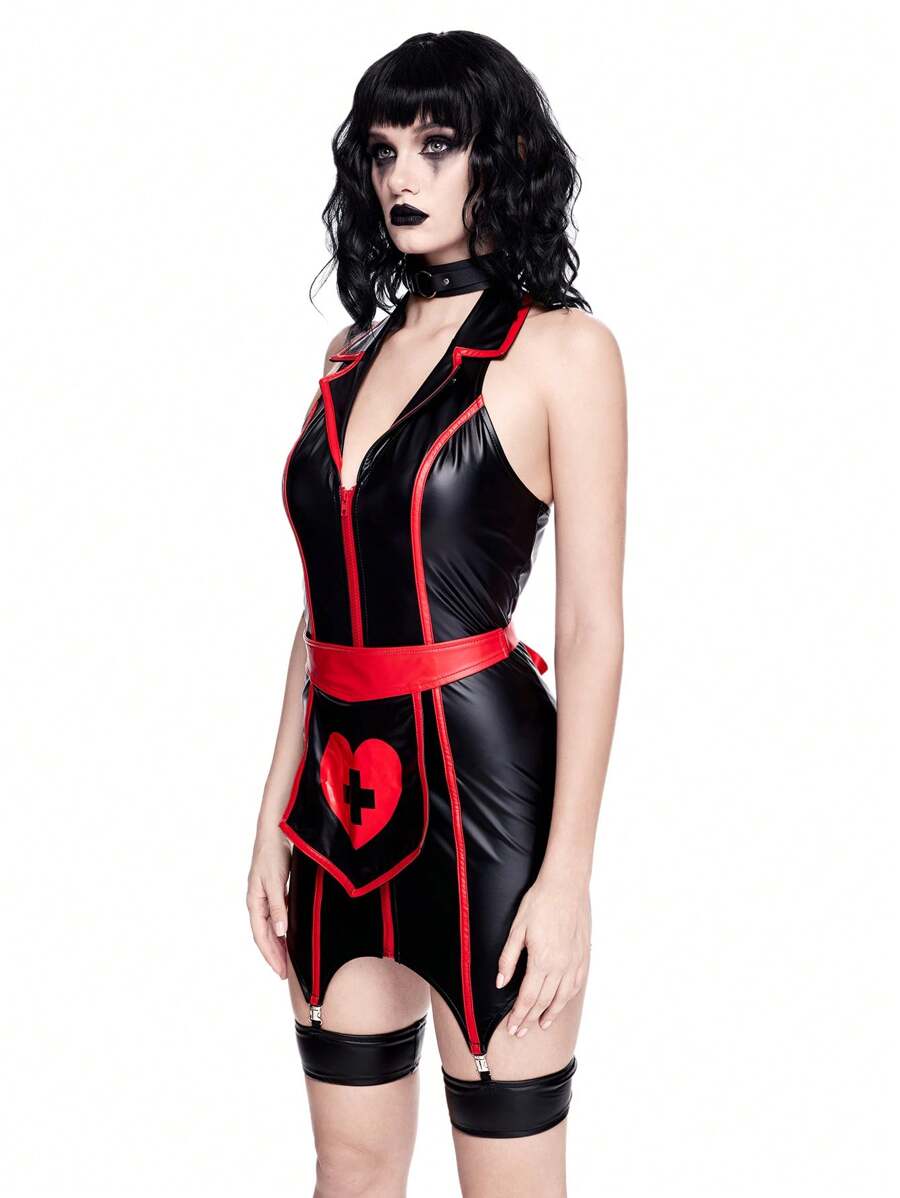 ROMWE Avant Dark Halloween Cosplay Nurse Costume Skin-Tight PU Dress