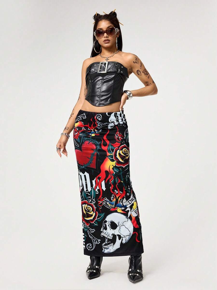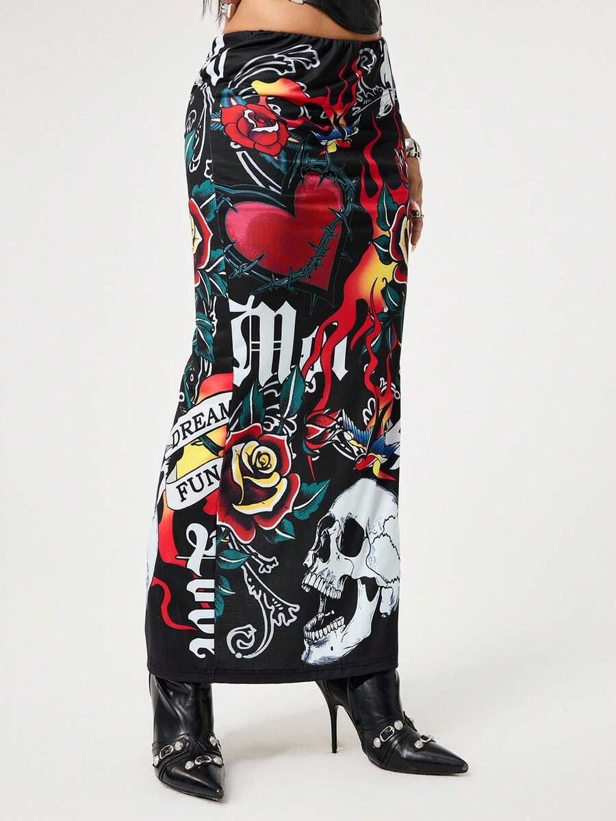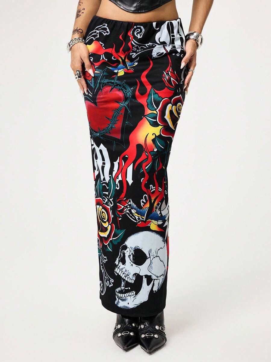 ROMWE Avant Halloween Women Skirts Y2K Retro Baddie Style Skeleton, Heart, Flame Print Women Mini Skirt