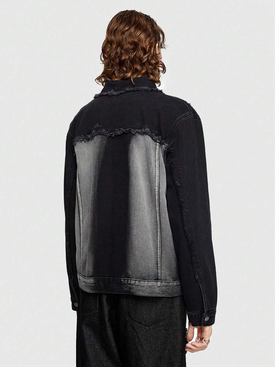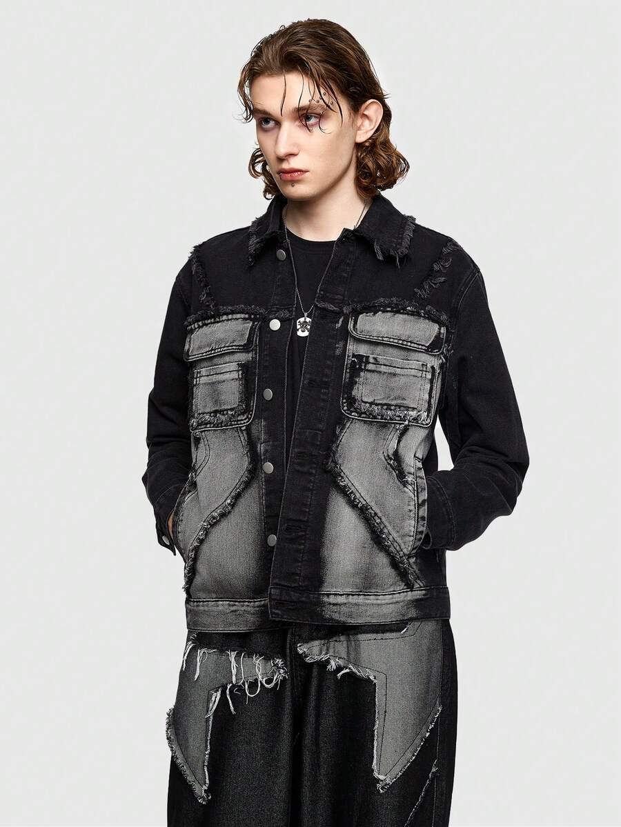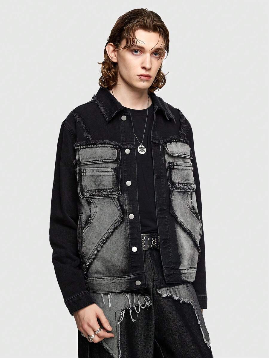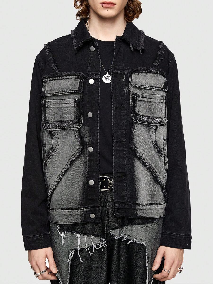 ROMWE Avant Men Color Block Denim Jacket With Button Closure And Patch Pocket