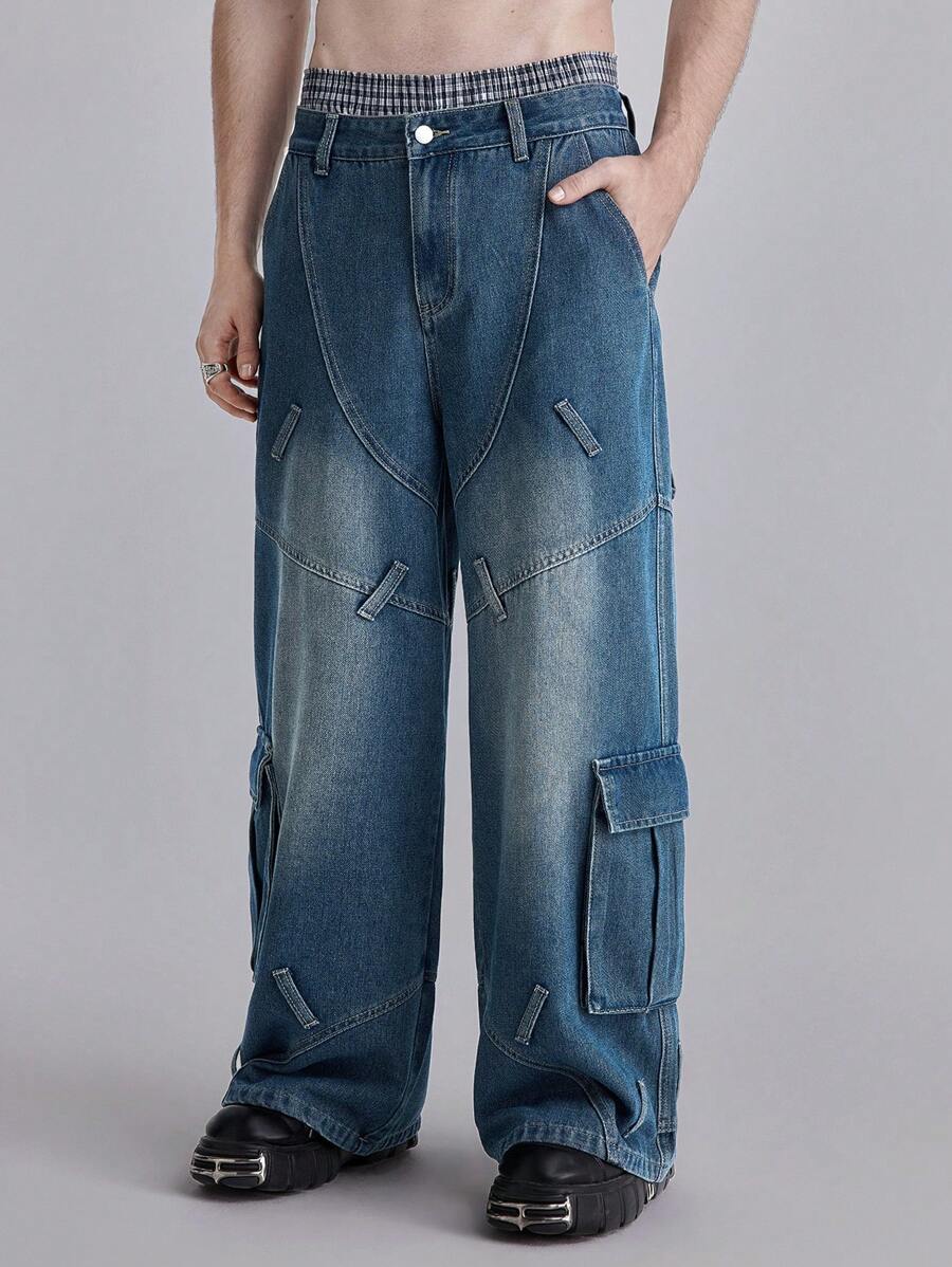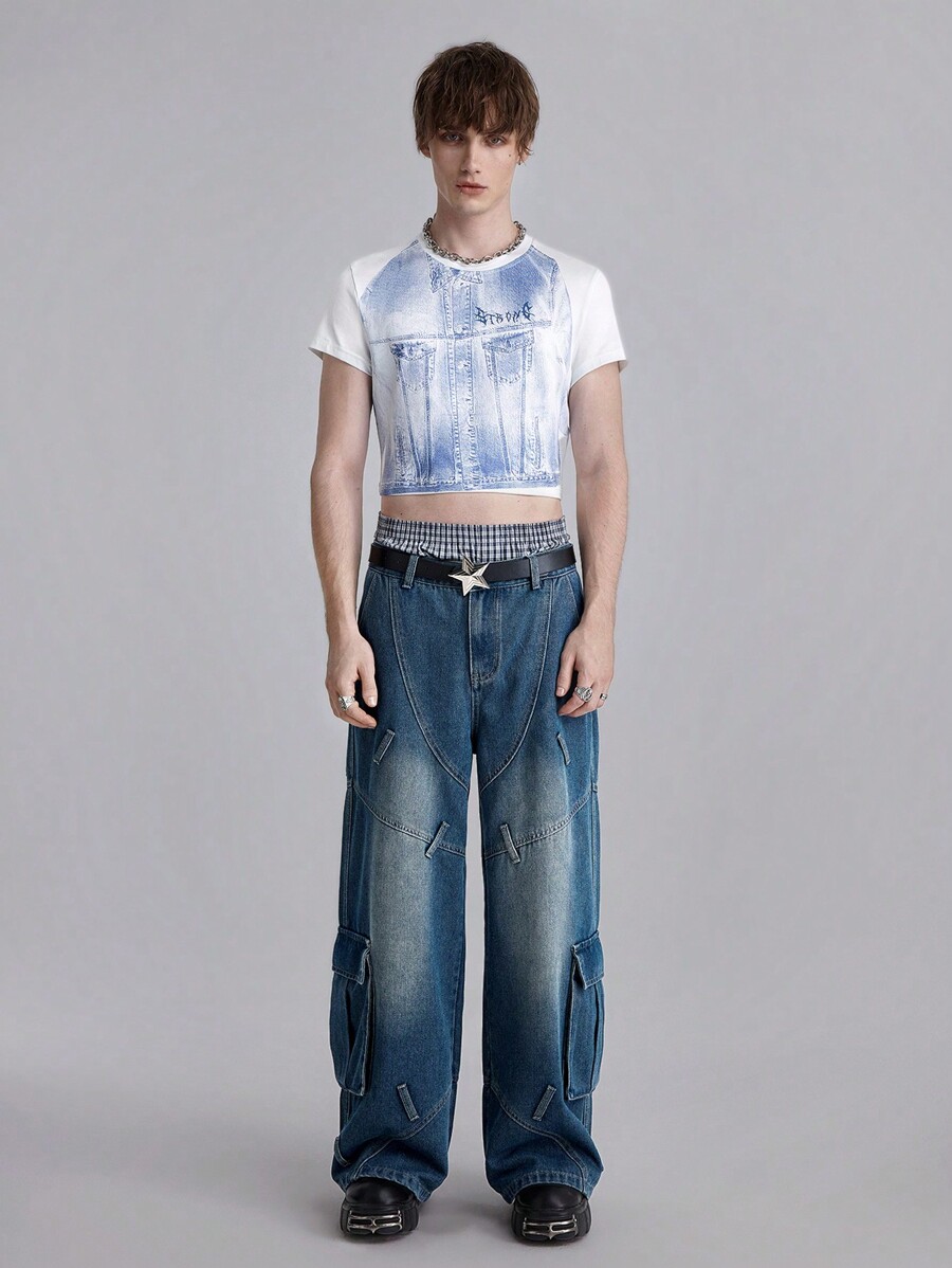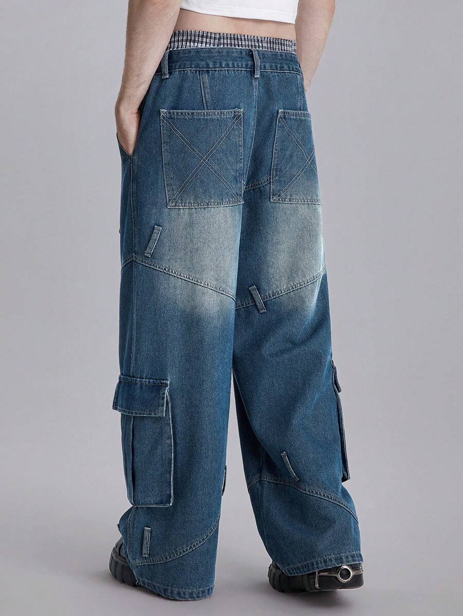 ROMWE Avant Men's Loose Wide Leg Casual Denim Pants With Pockets, Workwear
