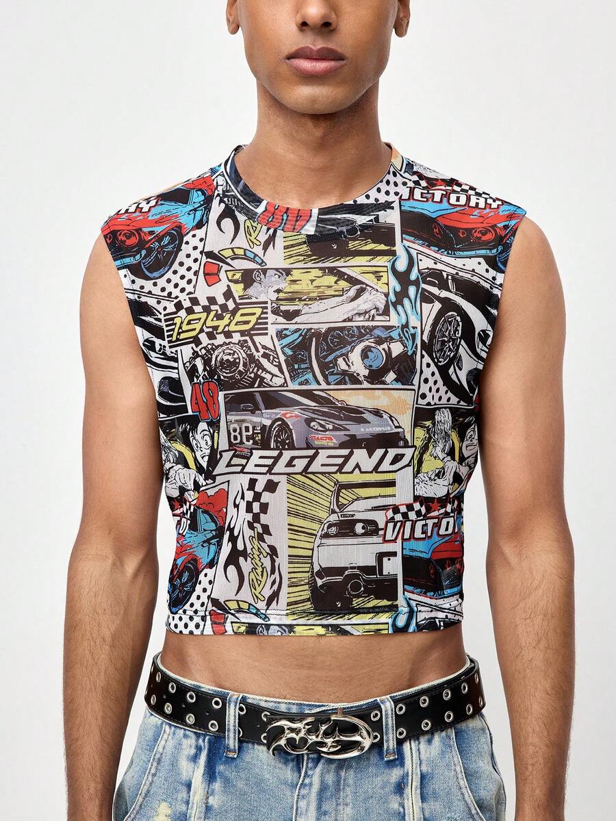 ROMWE Avant Men's Round Neck Allover Print Sleeveless Tank Top, Casual Vacation, School