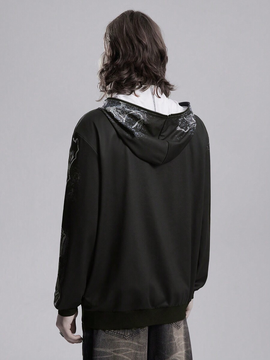 Goth Men's Zip Front Long Sleeve Skull Skeleton Print Hoodie, Casual Everyday Wear Sweatshirt