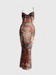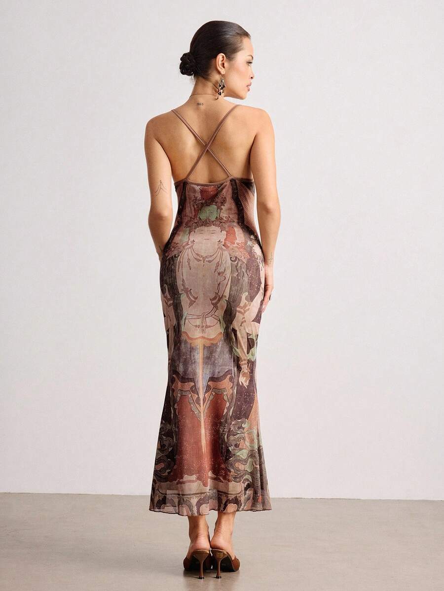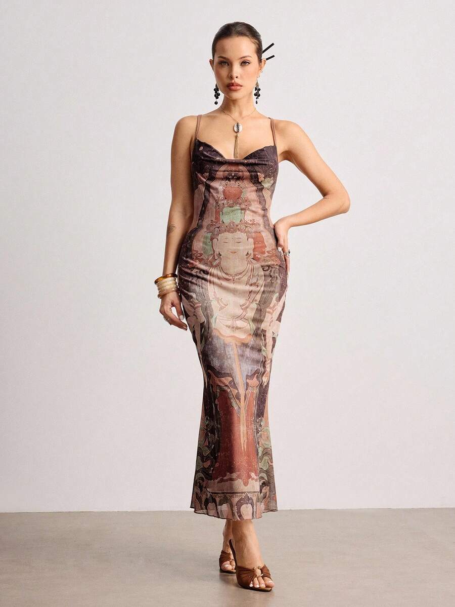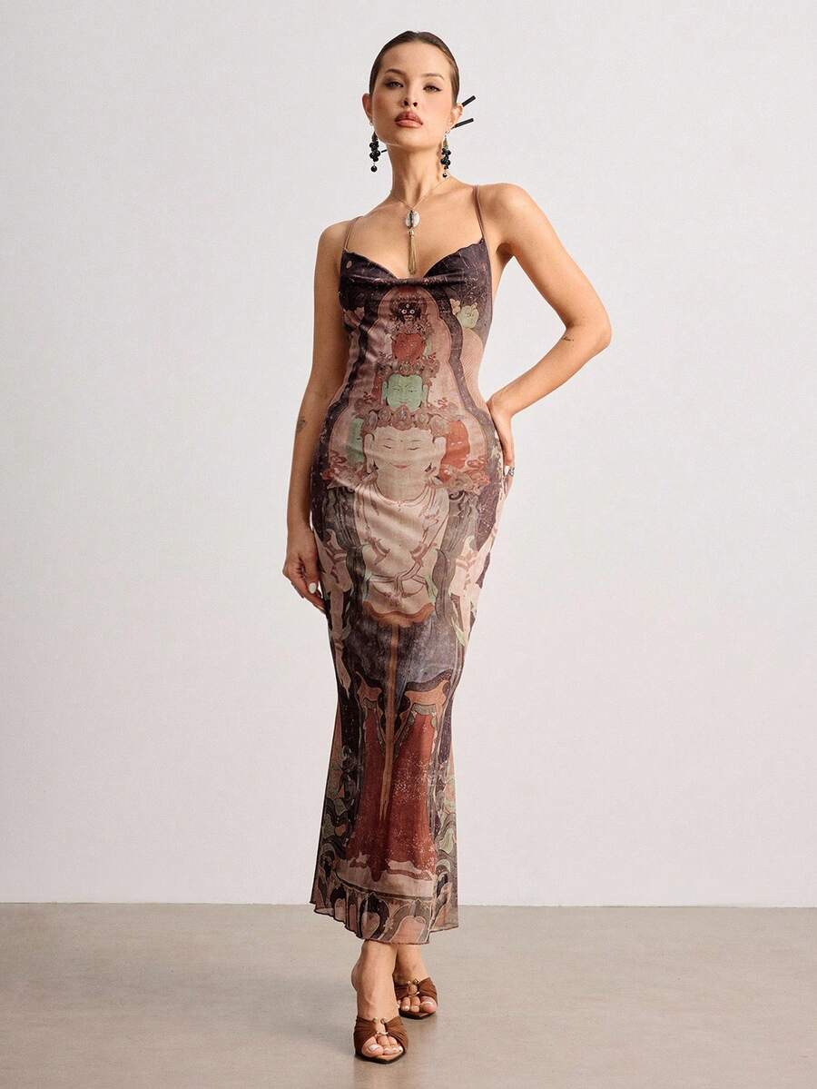 ROMWE Avant Oriental Aesthetic Vintage Buddha Statue Mesh Women Long Dress