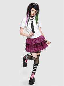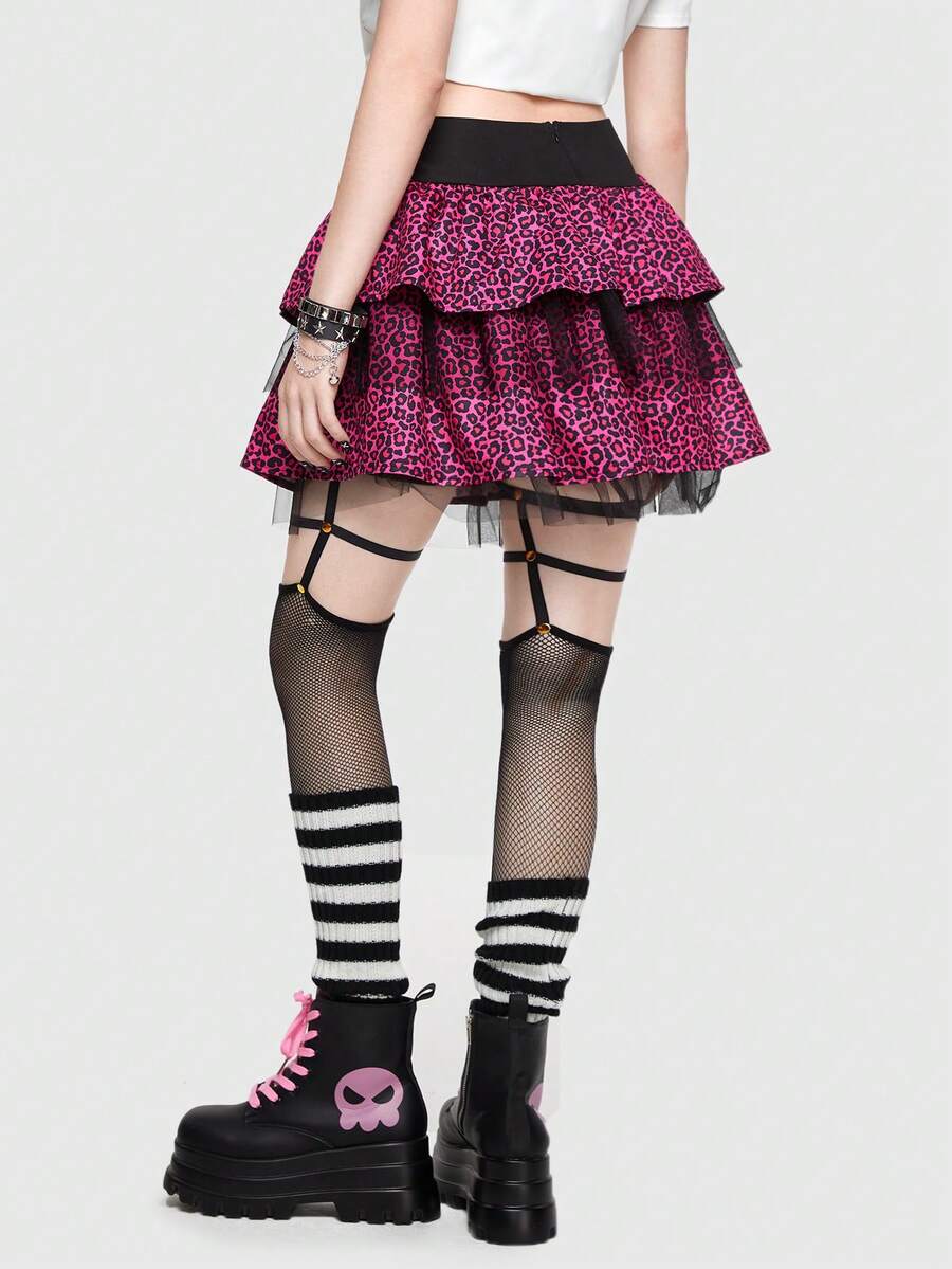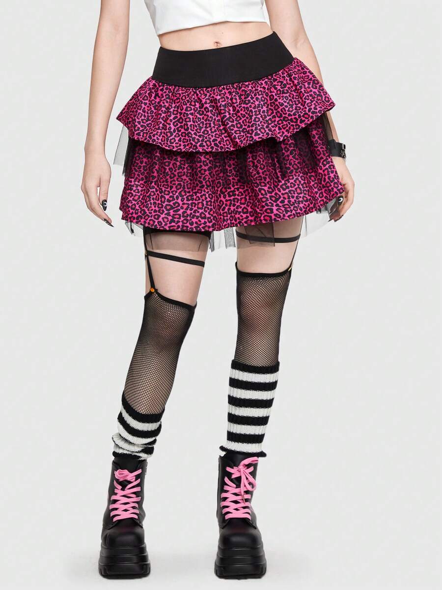 ROMWE Avant Scene Outfits Leopard Print Mesh Overlay Ruffle Trim Skirt