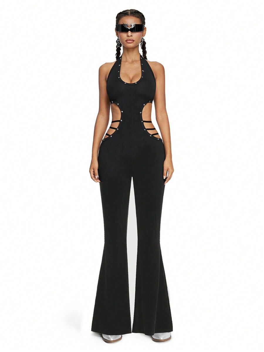 ROMWE Avant Star Rivet Waist Halter Backless Jumpsuit, Rave Festival