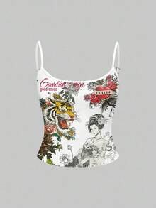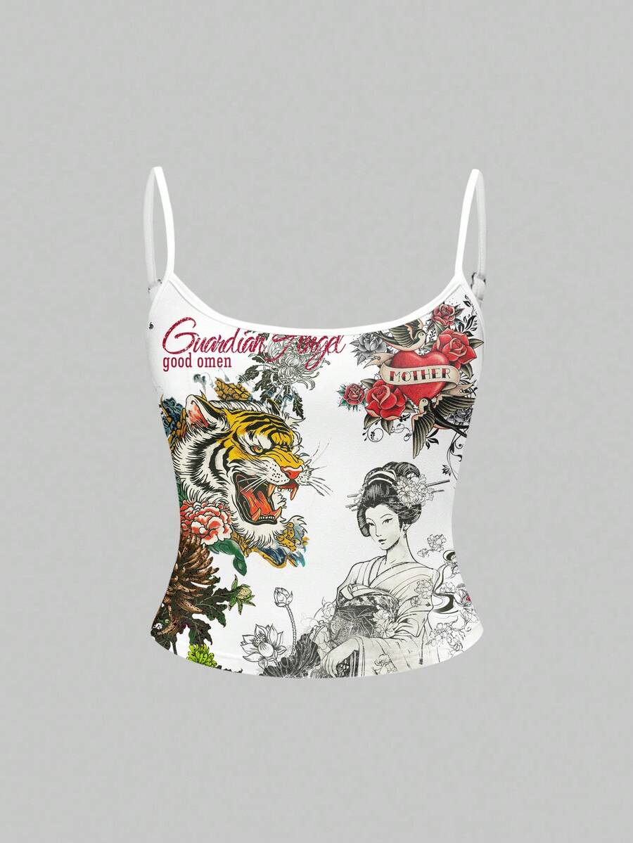ROMWE Avant SummergraphicwhiteSexy Punk Tiger Chinese Style Music Festival Calligraphy Tiger Bamboo Slogan Rose Chrysanthemum Women Tank Top