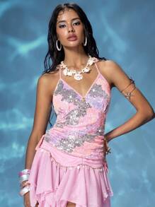 ROMWE Avant Vacation Style Halter Beaded Embroidery Dopamine Tank Top