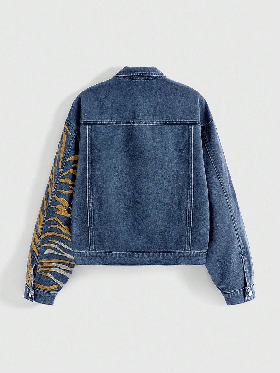 ROMWE Avant Vintage Street-Style Chinese Tiger Print 3D Embroidery Denim Jacket, Unisex