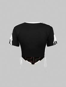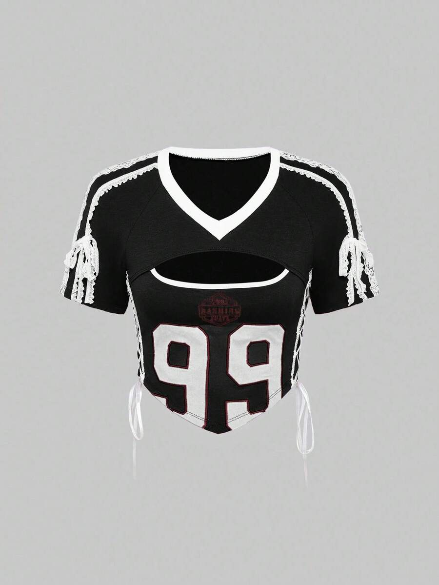 ROMWE Avant Women's Sexy Sports Ballet Lace Patchwork Embroidered Numeric Tight T-Shirt
