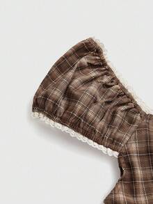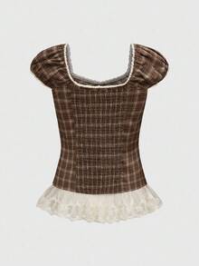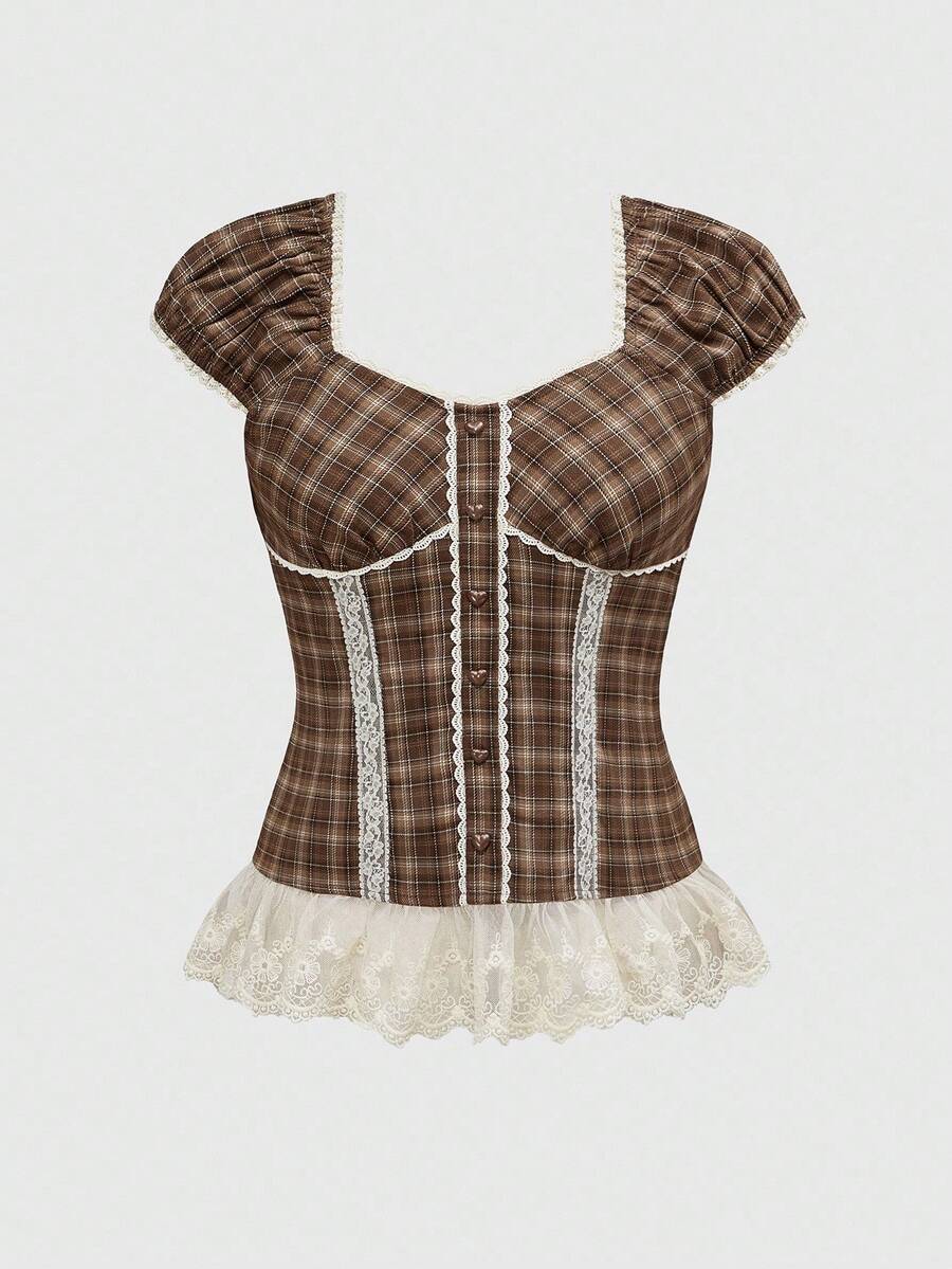 ROMWE Avant Women's Sweetheart Collar Plaid Lace Trim Splice Fashion Blouse