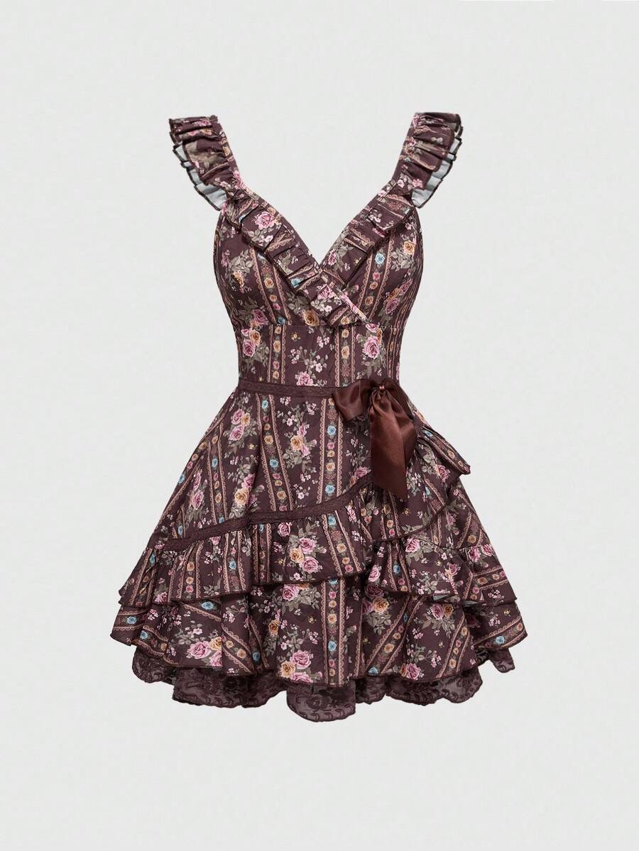 ROMWE Avant Spring/Summer Valentine's Day Women's Vintage Mori Kei Cottagecore Ditsy Floral Fabric Mini Dress With Flutter Sleeves , Lace Trim, Bow Accent, Layered Ruffle Hem