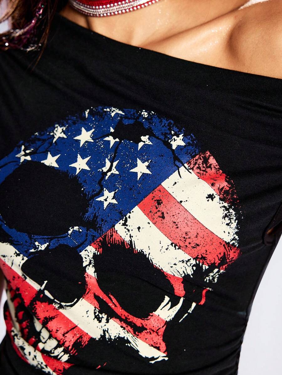 ROMWE Avant Women's Y2K Retro Music Festival Independence Day Skull Print Asymmetrical Shoulder Sexy T-Shirt