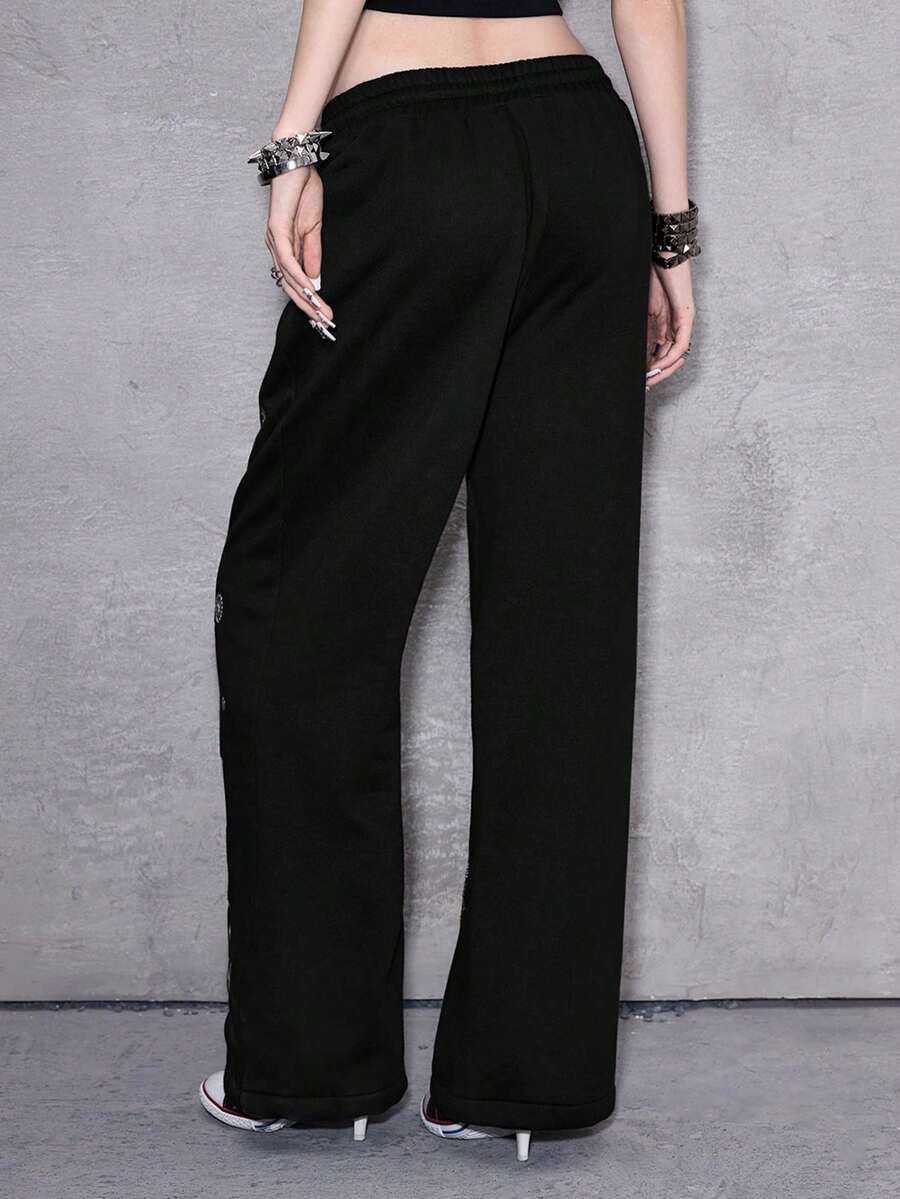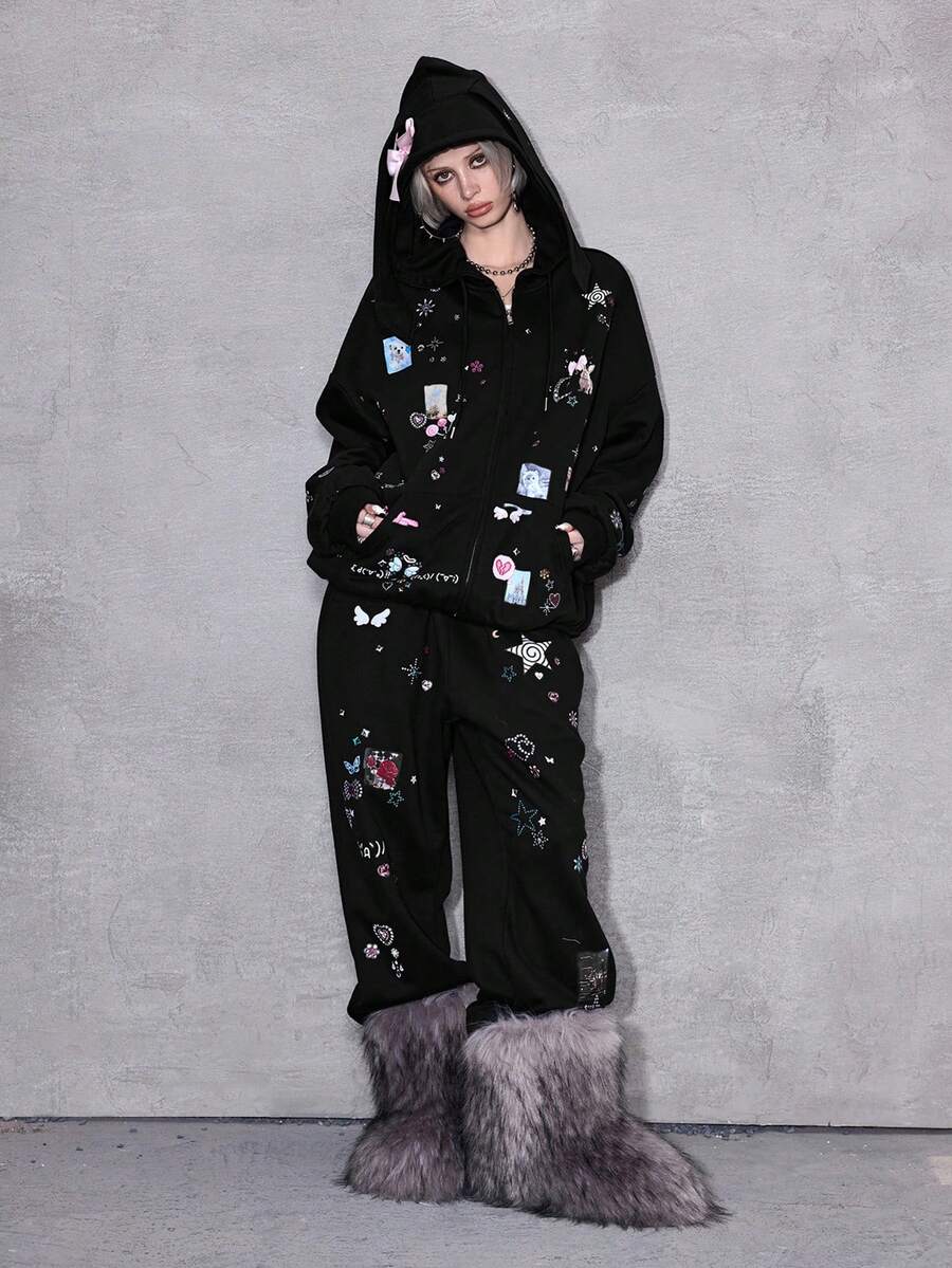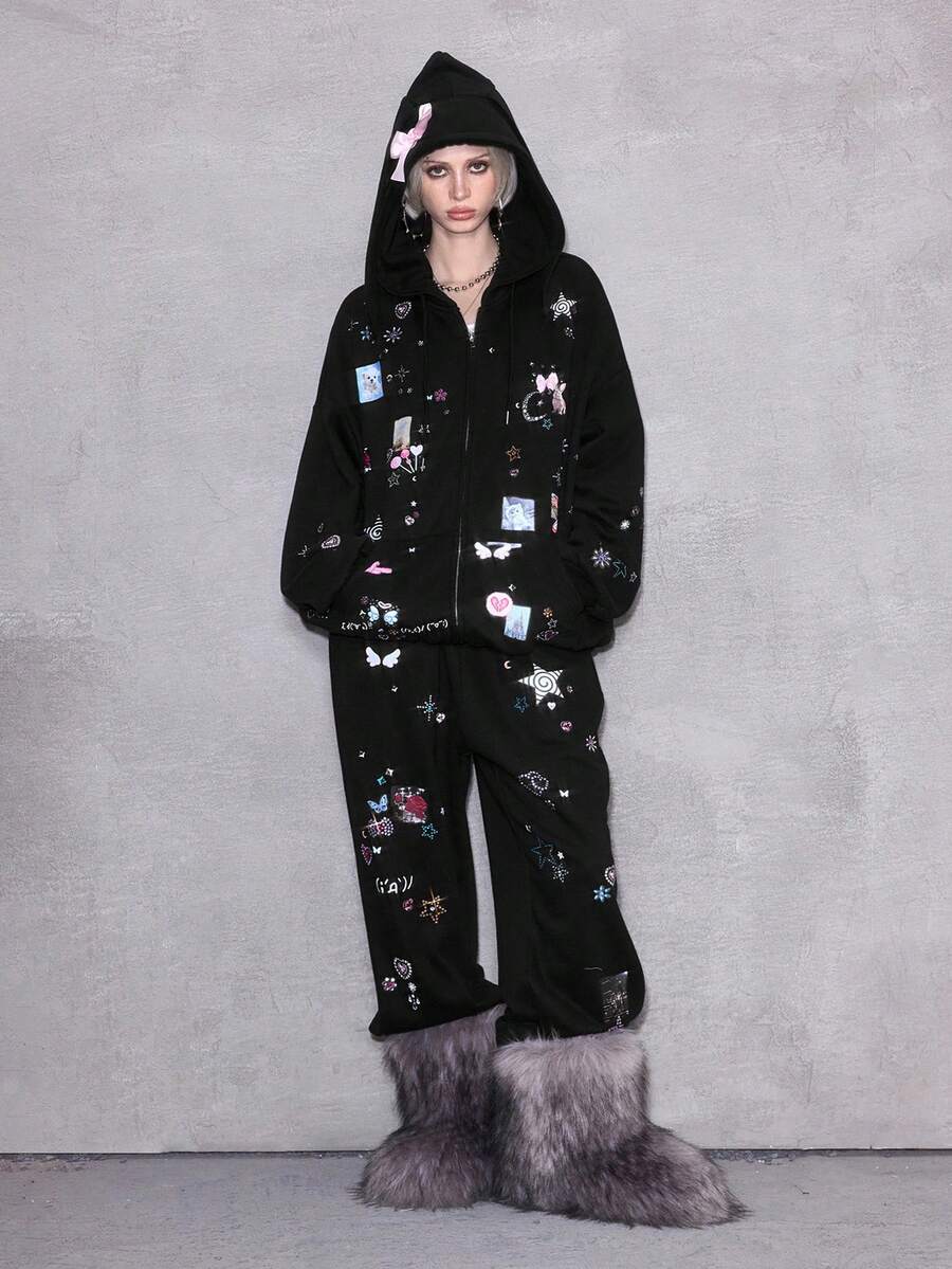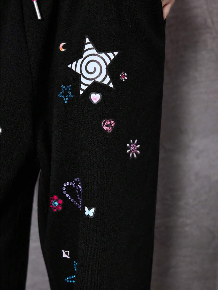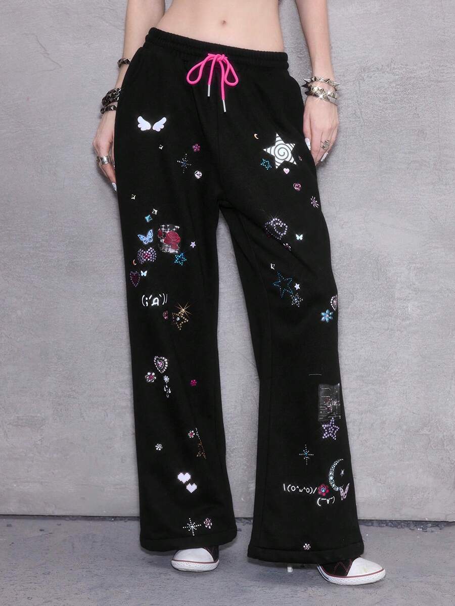ROMWE Avant Y2K Baddie Punk Girl Bow, Pixel Star, Moon, Heart, Swirl, Rose Print Drawstring Loose Fit Sweatpants With Rhinestones
