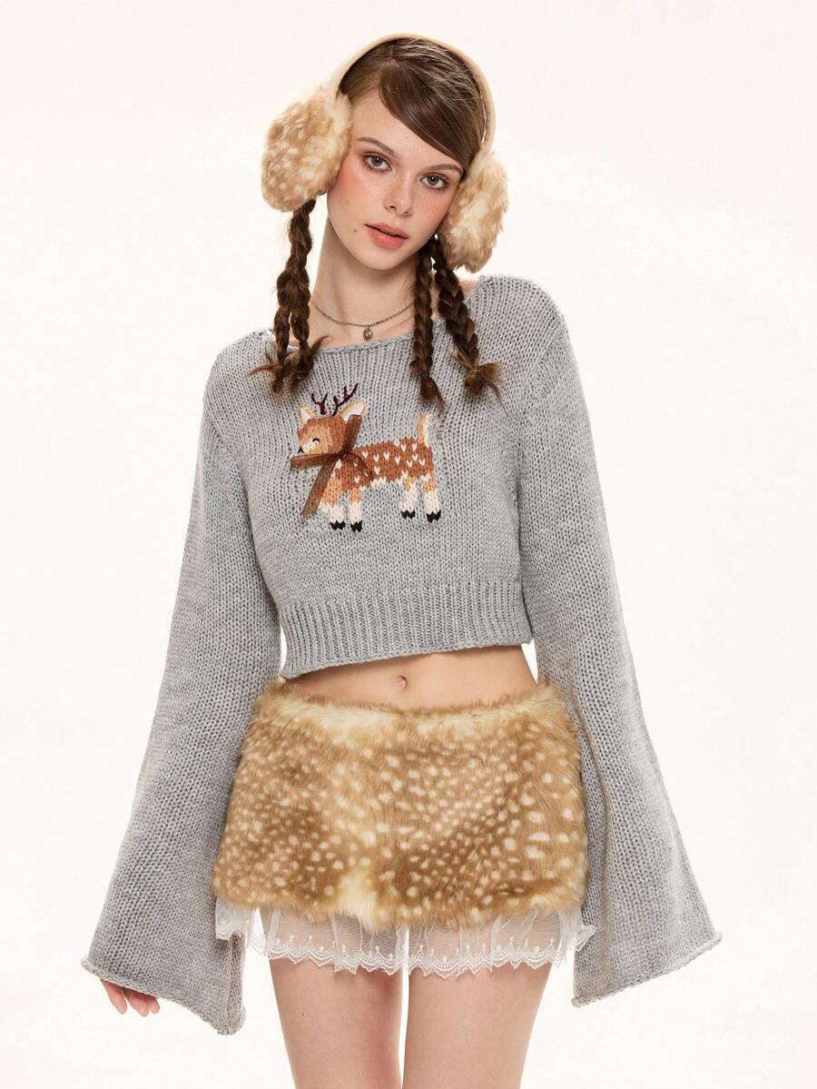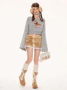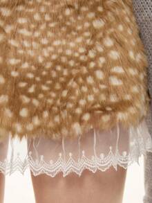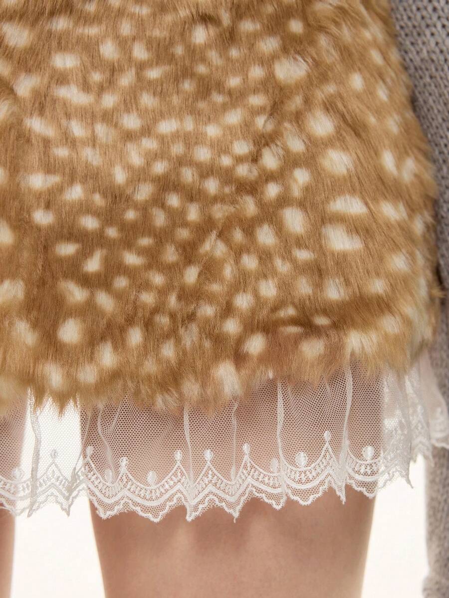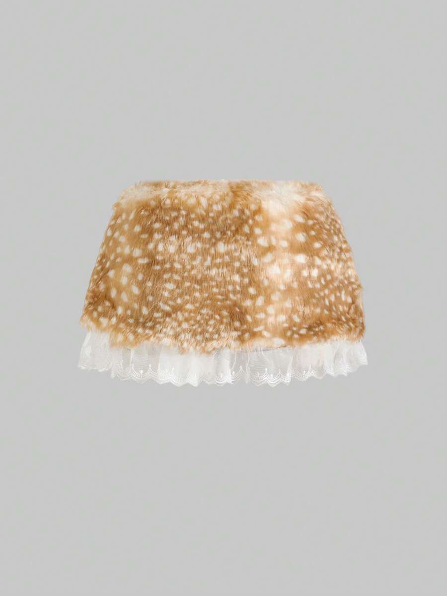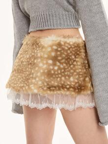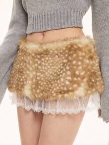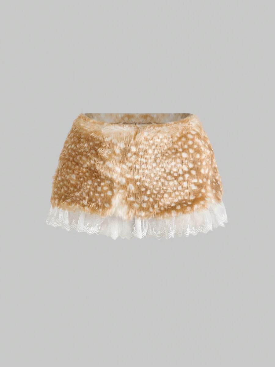 ROMWE Avant Y2K Sexy Deer Spot Print Lace Trim Fluffy Low Waist Mini Skirt For Women